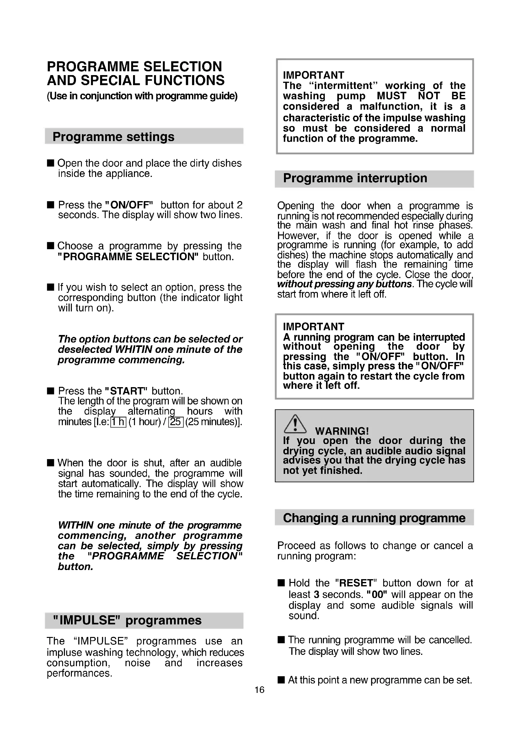 (Use in conjunction with programme guide) Programme settings ■ Open the door and place the dirty dishes inside the appliance. ■ Press the "ON/OFF" button for about 2 seconds. The display will show two lines. ■ Choose a programme by pressing the "PROGRAMME SELECTION" button. ■ If you wish to select an option, press the corresponding button (the indicator light will turn on). The option buttons can be selected or deselected WHITIN one minute of the programme commencing. ■ Press the "START" button. The length of the program will be shown on the display alternating hours with minutes [I.e: 1 h (1 hour) / 25 (25 minutes)]. ■ When the door is shut, after an audible signal has sounded, the programme will start automatically. The display will show the time remaining to the end of the cycle. WITHIN one minute of the programme commencing, another programme can be selected, simply by pressing the "PROGRAMME SELECTION" button. "IMPULSE" programmes The “IMPULSE” programmes use an impluse washing technology, which reduces consumption, noise and increases performances. IMPORTANT The “intermittent” working of the washing pump MUST NOT BE considered a malfunction, it is a characteristic of the impulse washing so must be considered a normal function of the programme. Programme interruption Opening the door when a programme is running is not recommended especially during the main wash and final hot rinse phases. However, if the door is opened while a programme is running (for example, to add dishes) the machine stops automatically and the display will flash the remaining time before the end of the cycle. Close the door, without pressing any buttons. The cycle will start from where it left off. IMPORTANT A running program can be interrupted without opening the door by pressing the "ON/OFF" button. In this case, simply press the "ON/OFF" button again to restart the cycle from where it left off. WARNING! If you open the door during the drying cycle, an audible audio signal advises you that the drying cycle has not yet finished. Changing a running programme Proceed as follows to change or cancel a running program: ■ Hold the "RESET" button down for at least 3 seconds. "00" will appear on the display and some audible signals will sound. ■ The running programme will be cancelled. The display will show two lines. ■ At this point a new programme can be set.reduction of energy consumption. The automatic door opening in the last phase of drying enables the air to circulate, removing the risk of bad odours. IMPORTANT This option is automatically activated on the "ECO" programme, it is however possible to disable it. The function "SMART DOOR" is not available in the programme "ULTRA RAPID 24'" and "REFRESH". ATTENTION With this option selected, you must not in any way prevent the door from opening or force it shut, as this will damage the mechanism. Ensure that there is free space in front of the door and before closing wait for the return opening device. "ALL IN 1" button This option optimises the use of "ALL in 1" ("3 in 1"/"4 in 1"/"5 in 1", ecc.) combined detergents. By pressing this button, the selected washing programme is modified to get best performance from combined detergents (furthermore, the salt empty alert will be de-activated). WARNING! Once selected, this option keeps being on (light on) also for next washing cycles and it can be de-activate (light off) only by pressing the button once again. IMPORTANT This option is recommended when using the ULTRA RAPID 24' program, the duration of which will be extended for about 15 minutes, allowing the detergent tablets to achieve a better performance.