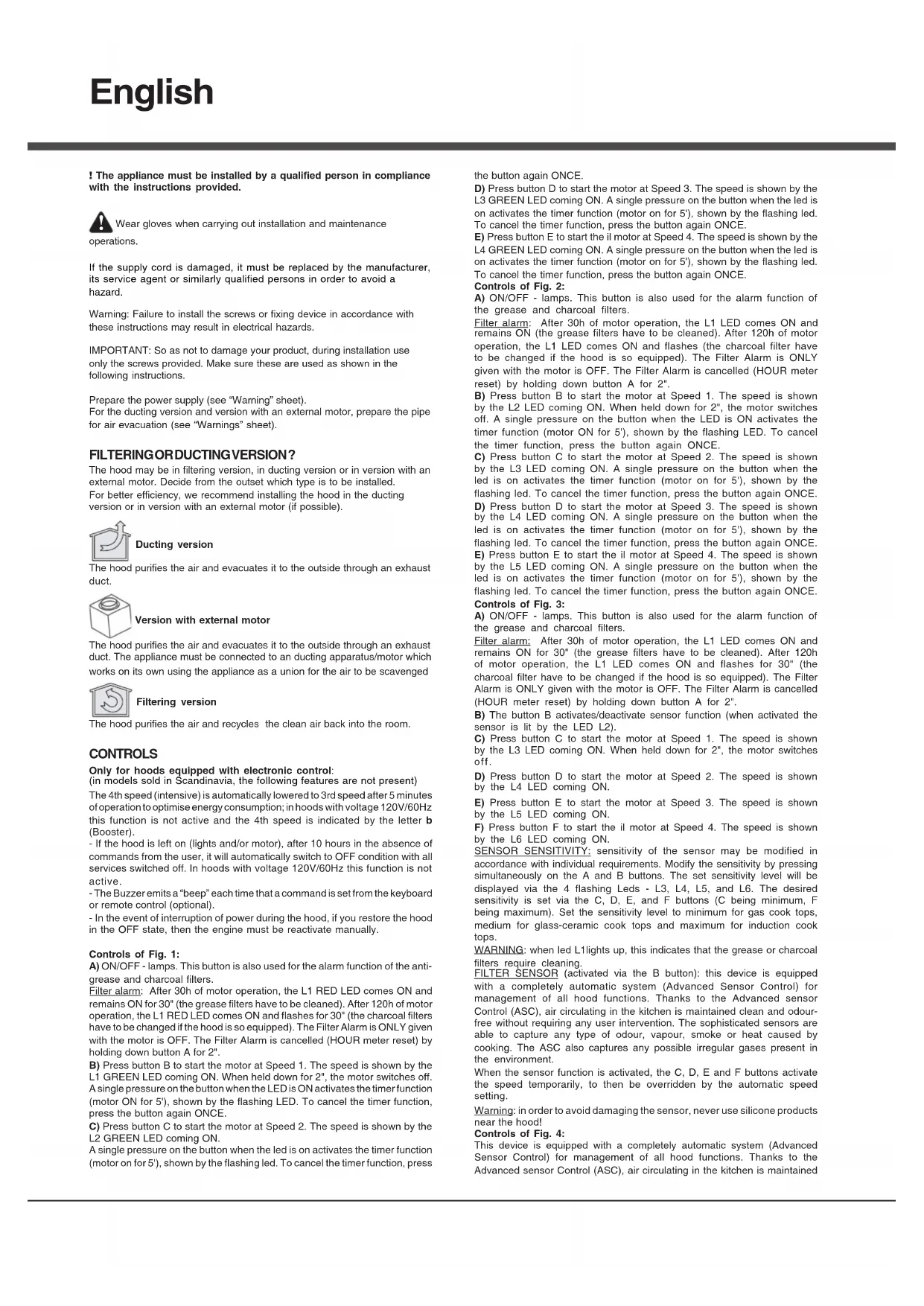 these instructions may result in electrical hazards. IMPORTANT: So as not to damage your product, during installation use only the screws provided. Make sure these are used as shown in the following instructions. Prepare the power supply (see “Warning” sheet). For the ducting version and version with an external motor, prepare the pipe for air evacuation (see “Warnings” sheet). FILTERING OR DUCTING VERSION ? The hood may be in filtering version, in ducting version or in version with an external motor. Decide from the outset which type is to be installed. For better efficiency, we recommend installing the hood in the ducting version or in version with an external motor (if possible). Ducting version The hood purifies the air and evacuates it to the outside through an exhaust duct. Version with external motor The hood purifies the air and evacuates it to the outside through an exhaust duct. The appliance must be connected to an ducting apparatus/motor which works on its own using the appliance as a union for the air to be scavenged Filtering version The hood purifies the air and recycles the clean air back into the room. CONTROLS Only for hoods equipped with electronic control: (in models sold in Scandinavia, the following features are not present) The 4th speed (intensive) is automatically lowered to 3rd speed after 5 minutes of operation to optimise energy consumption; in hoods with voltage 120V/60Hz this function is not active and the 4th speed is indicated by the letter b (Booster). - If the hood is left on (lights and/or motor), after 10 hours in the absence of commands from the user, it will automatically switch to OFF condition with all services switched off. In hoods with voltage 120V/60Hz this function is not active. - The Buzzer emits a “beep” each time that a command is set from the keyboard or remote control (optional). - In the event of interruption of power during the hood, if you restore the hood in the OFF state, then the engine must be reactivate manually. Controls of Fig. 1: A) ON/OFF - lamps. This button is also used for the alarm function of the anti- grease and charcoal filters. Filter alarm: After 30h of motor operation, the L1 RED LED comes ON and remains ON for 30" (the grease filters have to be cleaned). After 120h of motor operation, the L1 RED LED comes ON and flashes for 30" (the charcoal filters have to be changed if the hood is so equipped). The Filter Alarm is ONLY given with the motor is OFF. The Filter Alarm is cancelled (HOUR meter reset) by holding down button A for 2". B) Press button B to start the motor at Speed 1. The speed is shown by the L1 GREEN LED coming ON. When held down for 2", the motor switches off. A single pressure on the button when the LED is ON activates the timer function (motor ON for 5'), shown by the flashing LED. To cancel the timer function, press the button again ONCE. C) Press button C to start the motor at Speed 2. The speed is shown by the L2 GREEN LED coming ON. A single pressure on the button when the led is on activates the timer function (motor on for 5'), shown by the flashing led. To cancel the timer function, press the button again ONCE. D) Press button D to start the motor at Speed 3. The speed is shown by the L3 GREEN LED coming ON. A single pressure on the button when the led is on activates the timer function (motor on for 5'), shown by the flashing led. To cancel the timer function, press the button again ONCE. E) Press button E to start the il motor at Speed 4. The speed is shown by the L4 GREEN LED coming ON. A single pressure on the button when the led is on activates the timer function (motor on for 5'), shown by the flashing led. To cancel the timer function, press the button again ONCE. Controls of Fig. 2: A) ON/OFF - lamps. This button is also used for the alarm function of the grease and charcoal filters. Filter alarm: After 30h of motor operation, the L1 LED comes ON and remains ON (the grease filters have to be cleaned). After 120h of motor operation, the L1 LED comes ON and flashes (the charcoal filter have to be changed if the hood is so equipped). The Filter Alarm is ONLY given with the motor is OFF. The Filter Alarm is cancelled (HOUR meter reset) by holding down button A for 2". B) Press button B to start the motor at Speed 1. The speed is shown by the L2 LED coming ON. When held down for 2", the motor switches off. A single pressure on the button when the LED is ON activates the timer function (motor ON for 5'), shown by the flashing LED. To cancel the timer function, press the button again ONCE. C) Press button C to start the motor at Speed 2. The speed is shown by the L3 LED coming ON. A single pressure on the button when the led is on activates the timer function (motor on for 5'), shown by the flashing led. To cancel the timer function, press the button again ONCE. D) Press button D to start the motor at Speed 3. The speed is shown by the L4 LED coming ON. A single pressure on the button when the led is on activates the timer function (motor on for 5'), shown by the flashing led. To cancel the timer function, press the button again ONCE. E) Press button E to start the il motor at Speed 4. The speed is shown by the L5 LED coming ON. A single pressure on the button when the led is on activates the timer function (motor on for 5'), shown by the flashing led. To cancel the timer function, press the button again ONCE. Controls of Fig. 3: A) ON/OFF - lamps. This button is also used for the alarm function of the grease and charcoal filters. Filter alarm: After 30h of motor operation, the L1 LED comes ON and remains ON for 30" (the grease filters have to be cleaned). After 120h of motor operation, the L1 LED comes ON and flashes for 30" (the charcoal filter have to be changed if the hood is so equipped). The Filter Alarm is ONLY given with the motor is OFF. The Filter Alarm is cancelled (HOUR meter reset) by holding down button A for 2". B) The button B activates/deactivate sensor function (