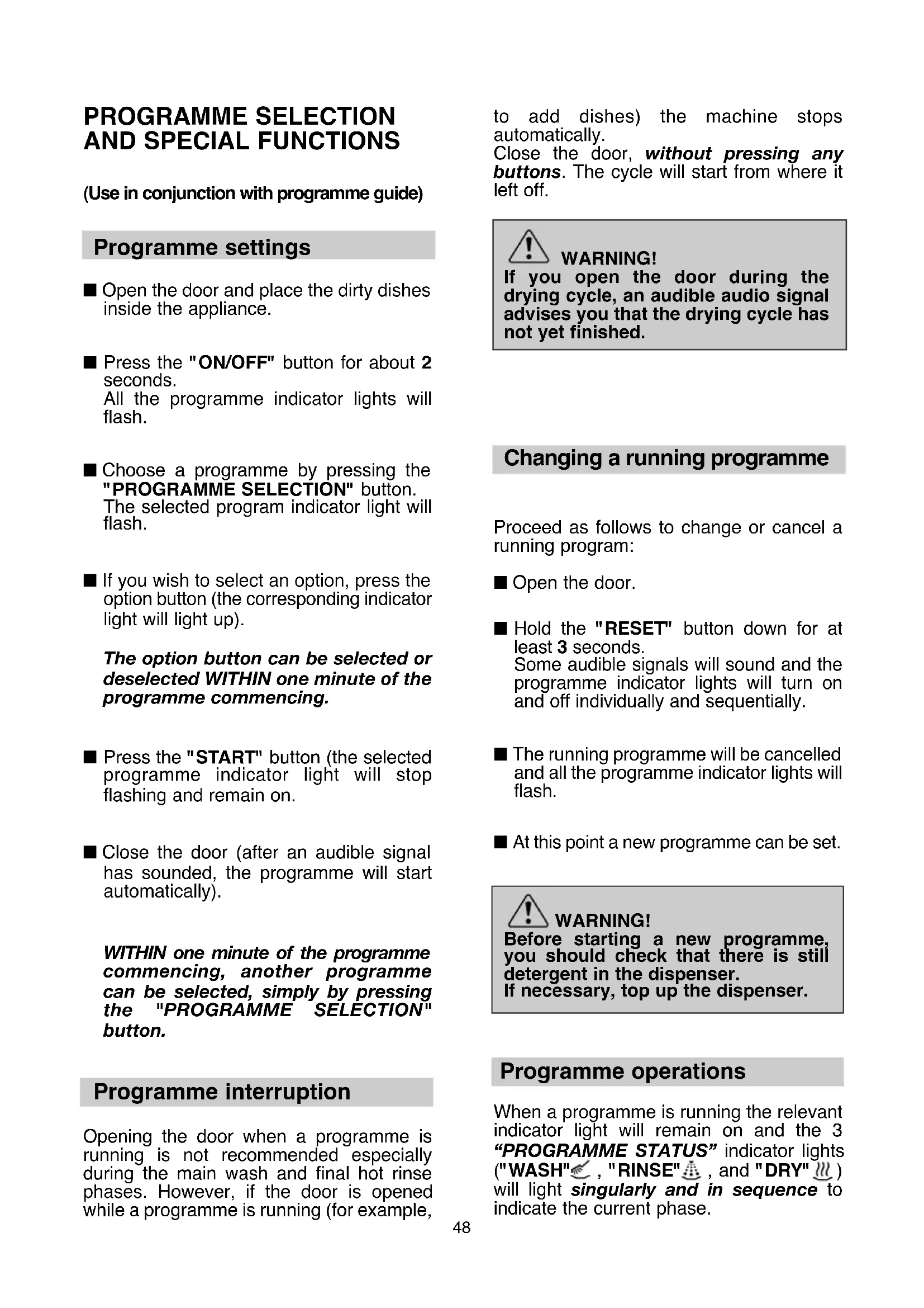 to add dishes) the machine stops automatically. Close the door, without pressing any buttons. The cycle will start from where it left off. WARNING! If you open the door during the drying cycle, an audible audio signal advises you that the drying cycle has not yet finished. Changing a running programme Proceed as follows to change or cancel a running program: ■ Open the door. ■ Hold the "RESET" button down for at least 3 seconds. Some audible signals will sound and the programme indicator lights will turn on and off individually and sequentially. ■ The running programme will be cancelled and all the programme indicator lights will flash. ■ At this point a new programme can be set. WARNING! Before starting a new programme, you should check that there is still detergent in the dispenser. If necessary, top up the dispenser. Programme operations When a programme is running the relevant indicator light will remain on and the 3 “PROGRAMME STATUS” indicator lights ("WASH" , "RINSE" , and "DRY" ) will light singularly and in sequence to indicate the current phase. PROGRAMME SELECTION