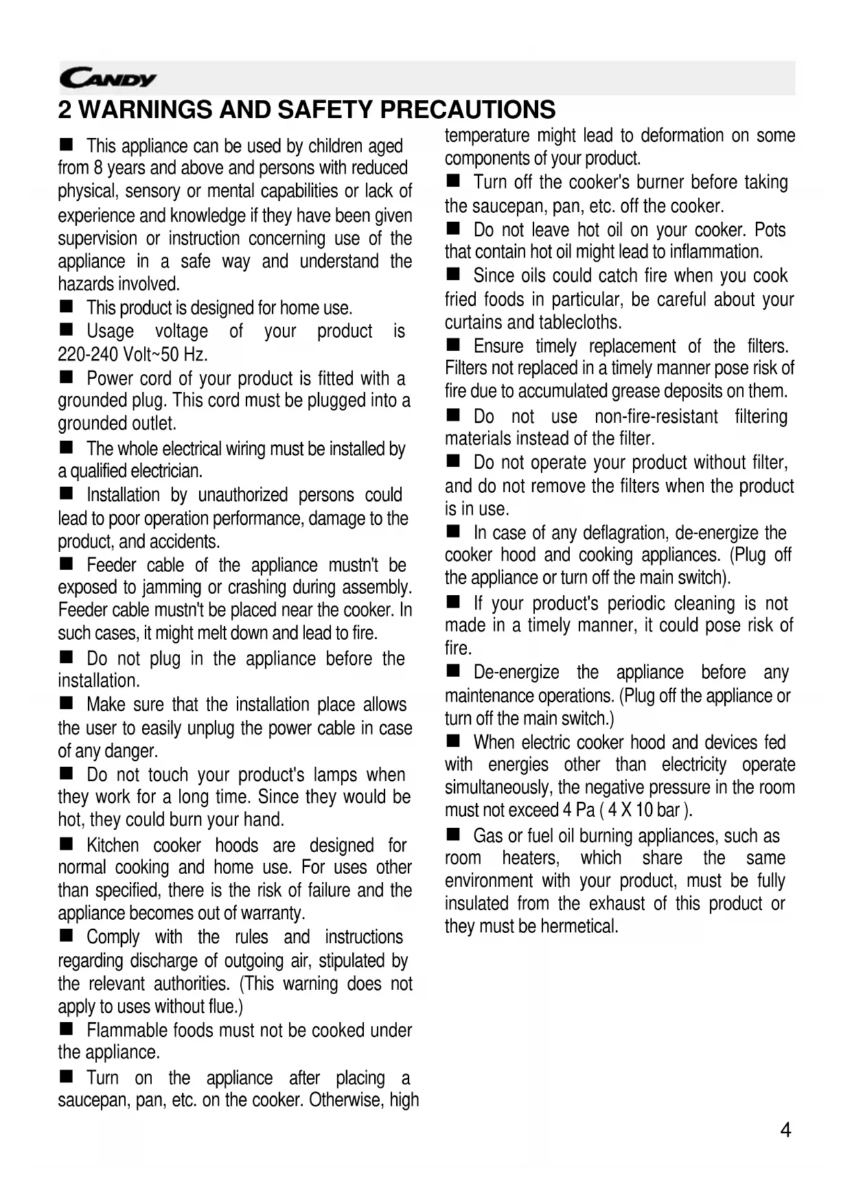 This appliance can be used by children aged from 8 years and above and persons with reduced physical, sensory or mental capabilities or lack of experience and knowledge if they have been given supervision or instruction concerning use of the appliance in a safe way and understand the hazards involved. This product is designed for home use. Usage voltage of your product is 220-240 Volt~50 Hz. Power cord of your product is fitted with a grounded plug. This cord must be plugged into a grounded outlet. The whole electrical wiring must be installed by a qualified electrician. Installation by unauthorized persons could lead to poor operation performance, damage to the product, and accidents. Feeder cable of the appliance mustn't be exposed to jamming or crashing during assembly. Feeder cable mustn't be placed near the cooker. In such cases, it might melt down and lead to fire. Do not plug in the appliance before the installation. Make sure that the installation place allows the user to easily unplug the power cable in case of any danger. Do not touch your product's lamps when they work for a long time. Since they would be hot, they could burn your hand. Kitchen cooker hoods are designed for normal cooking and home use. For uses other than specified, there is the risk of failure and the appliance becomes out of warranty. Comply with the rules and instructions regarding discharge of outgoing air, stipulated by the relevant authorities. (This warning does not apply to uses without flue.) Flammable foods must not be cooked under the appliance. Turn on the appliance after placing a saucepan, pan, etc. on the cooker. Otherwise, high temperature might lead to deformation on some components of your product. Turn off the cooker's burner before taking the saucepan, pan, etc. off the cooker. Do not leave hot oil on your cooker. Pots that contain hot oil might lead to inflammation. Since oils could catch fire when you cook fried foods in particular, be careful about your curtains and tablecloths. Ensure timely replacement of the filters. Filters not replaced in a timely manner pose risk of fire due to accumulated grease deposits on them. Do not use non-fire-resistant filtering materials instead of the filter. Do not operate your product without filter, and do not remove the filters when the product is in use. In case of any deflagration, de-energize the cooker hood and cooking appliances. (Plug off the appliance or turn off the main switch). If your product's periodic cleaning is not made in a timely manner, it could pose risk of fire. De-energize the appliance before any maintenance operations. (Plug off the appliance or turn off the main switch.) When electric cooker hood and devices fed with energies other than electricity operate simultaneously, the negative pressure in the room must not exceed 4 Pa ( 4 X 10 bar ). Gas or fuel oil burning appliances, such as room heaters, which share the same environment with your product, must be fully insulated from the exhaust of this product or they must be hermetical.5 When you make a flue connection for your product, use pipes with a diameter of 150 mm or 120 mm. The length of the pipe connection as well as the number of elbows must be as minimum as possible. Children must not play with the appliance. For your safety, use ”MAX 6 A” fuse in the cooker hood system. Since the packing materials could be dangerous, keep them away from children. If the feeder cable is damaged, it must be replaced by its manufacturer or authorized technical service or any other personnel qualified at the same level, in order to avoid any dangerous situation. In case of any deflagration, de-energize the cooker hood and cooking appliances, and cover the flame. Never use water to extinguish the fire. When cooking appliances are in operation, their accessible parts could be hot. This appliance is not intended to be used by people with physical, sensory and mental disabilities (including children) or those who have not adequate experience and knowledge regarding its use, unless they are under the supervision of a person responsible for the safety of the appliance. After the installation of the cooker hood, the minimum distance must be 65 cm between the product and any electric cooker; and 75 cm between it and any gas ranges or cookers burning other fuels. Output of the cooker hood must not be connected to air ducts, where there exist another smokes. You must be careful when using the appliance spontaneously with other appliances (e.g. gas, diesel fuels, coal or wood burning heaters, shower heaters, etc.) Attention must be paid when using them simultaneously. It is because the cooker hood could adversely affect the combustion, by discharging the ambient air. This warning does not apply to uses without flue. When electric cooker hood is used simultaneously with devices that use gas or other fuels, there must be sufficient ventilation in the room (might not apply to devices that discharges the air back into the room). Simultaneous operation of more than one gas cooker leads to generation of high heat. A ventilation appliance placed on the surface of cookers might therefore get damaged or burn. Do not operate two gas cookers in high heat for more than 15 minutes. One large burner with more than 5kW (Work) power generates power equal to that of two gas burners.6