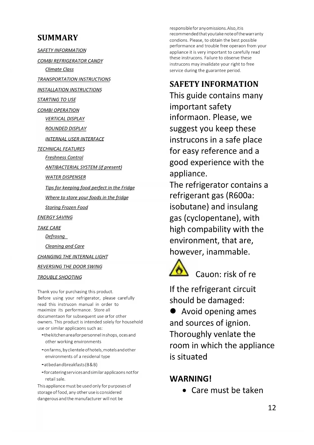 Sull'unità è riportato il simbolo di conformità alla Direttiva europea 2012/19/UE relativa allo smaltimento di apparecchiature elettriche ed elettroniche usate (WEEE). Le apparecchiature elettriche ed elettroniche di scarto contengono sostanze inquinanti (pericolose per l'ambiente) e componenti riutilizzabili. Le apparecchiature elettriche ed elettroniche di scarto devono essere sottoposte a trattamenti specifici per rimuovere e smaltire adeguatamente tutte le sostanze inquinanti e per recuperare e riciclare i materiali. Osservando alcune regole basilari, tutti possono contribuire a evitare danni ambientali causati dalle apparecchiature elettriche ed elettroniche di scarto: Le apparecchiature elettriche ed elettroniche di scarto non devono essere gestite come rifiuti domestici. Le apparecchiature elettriche ed elettroniche di scarto devono essere consegnate negli appositi punti di raccolta gestiti dagli enti comunali o da aziende regolarmente registrate. In molti paesi è prevista la raccolta a domicilio delle apparecchiature elettriche ed elettroniche di scarto di dimensioni notevoli. In molto paesi, quando si acquista un nuovo elettrodomestico, quello vecchio può essere restituito al rivenditore che è obbligato a prelevarlo gratuitamente alla consegna di quello nuovo, purché sia di tipo equivalente e abbia le stesse funzioni di quello fornito. Conformità L'applicazione del contrassegno sul prodotto garantisce la conformità a tutti i requisiti in materia di sicurezza, salute e ambiente previsti dalla legge.12 English SUMMARY SAFETY INFORMATION COMBI REFRIGERATOR CANDY Climate Class TRANSPORTATION INSTRUCTIONS INSTALLATION INSTRUCTIONS STARTING TO USE COMBI OPERATION VERTICAL DISPLAY ROUNDED DISPLAY INTERNAL USER INTERFACE TECHNICAL FEATURES Freshness Control ANTIBACTERIAL SYSTEM (if present) WATER DISPENSER Tips for keeping food perfect in the Fridge Where to store your foods in the fridge Storing Frozen Food ENERGY SAVING TAKE CARE Defrosting Cleaning and Care CHANGING THE INTERNAL LIGHT REVERSING THE DOOR SWING TROUBLE SHOOTING Thank you for purchasing this product. Before using your refrigerator, please carefully read this instruction manual in order to maximize its performance. Store all documentation for subsequent use or for other owners. This product is intended solely for household use or similar applications such as: - the kitchen area for personnel in shops, offices and other working environments - on farms, by clientele of hotels, motels and other environments of a residential type - at bed and breakfasts (B & B) - for catering services and similar applications not for retail sale. This appliance must be used only for purposes of storage of food, any other use is considered dangerous and the manufacturer will not be responsible for any omissions. Also, it is recommended that you take note of the warranty conditions. Please, to obtain the best possible performance and trouble free operation from your appliance it is very important to carefully read these instructions. Failure to observe these instructions may invalidate your right to free service during the guarantee period. SAFETY INFORMATION This guide contains many important safety information. Please, we suggest you keep these instructions in a safe place for easy reference and a good experience with the appliance. The refrigerator contains a refrigerant gas (R600a: isobutane) and insulating gas (cyclopentane), with high compatibility with the environment, that are, however, inflammable. Caution: risk of fire If the refrigerant circuit should be damaged: Avoid opening flames and sources of ignition. Thoroughly ventilate the room in which the appliance is situated Percentage running WARNING! Care must be taken13 while cleaning/carrying the appliance to avoid touching the condenser metal wires at the back of the appliance, as you might injure your fingers and hands or damage your product. This appliance is not designed for stacking with any other appliance. Do not attempt to sit or stand on top of your appliance as it is not designed for such use. You could injure yourself or damage the appliance. Make sure that mains cable is not caught under the appliance during and after carrying/moving the appliance, to avoid the mains cable becoming cut or damaged. When positioning your appliance take care not to damage your flooring, pipes, wall coverings etc. Do not move the appliance by pulling by the lid or handle. Do not allow children to play with the appliance or tamper with the controls. Our company declines to accept any liability should the instructions not be followed. Do not install the appliance in humid, oily or dusty places, nor expose it to direct sunlight and to water. Do not install the appliance near heaters or inflammable materials. If there is a power failure do not open the lid. Frozen food should not be affected if the failure lasts for less than 20 hours. If the failure is longer, then the food14 should be checked and eaten immediately or cooked and then refrozen. If you find that the lid of the chest freezer is difficult to open just after you have closed it, don’t worry. This is due to the pressure difference which will equalize and allow the lid to be opened normally after a few minutes. Do not connect the appliance to the electricity supply until all packing and transit protectors have been removed. Leave to stand for at least 4 hours before switching on to allow compressor oil to settle if transported horizontally. This freezer must only be used for its intended purpose (i.e. storing and freezing of edible foodstuff). Do not store medicine or research materials in the Wine Coolers. When the material that requires a strict control of storage temperatures is to be stored, it is possible that it will deteriorate or an uncontrolled reaction may occur that can cause risks. Before performing any operation, unplug the power cord from the power socket. On delivery, check to make sure that the product is no