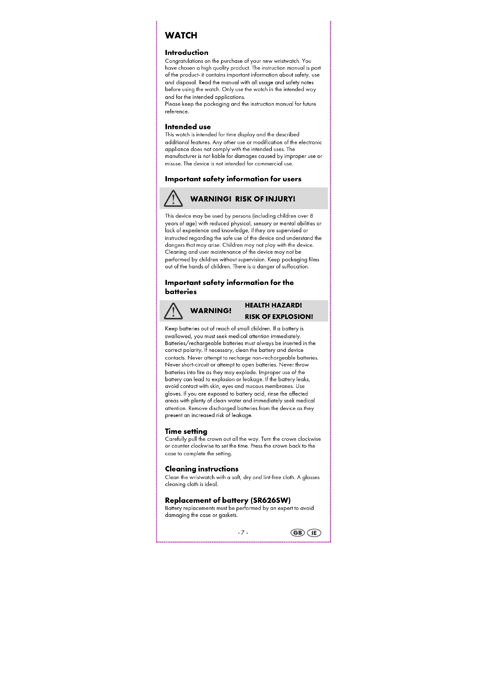 WARNING! HEALTH HAZARD! RISK OF EXPLOSION! Keep batteries out of reach of small children. If a battery is swallowed, you must seek medical attention immediately. Batteries/rechargeable batteries must always be inserted in the correct polarity. If necessary, clean the battery and device contacts. Never attempt to recharge non-rechargeable batteries. Never short-circuit or attempt to open batteries. Never throw batteries into fire as they may explode. Improper use of the battery can lead to explosion or leakage. If the battery leaks, avoid contact with skin, eyes and mucous membranes. Use gloves. If you are exposed to battery acid, rinse the affected areas with plenty of clean water and immediately seek medical attention. Remove discharged batteries from the device as they present an increased risk of leakage. Time setting Carefully pull the crown out all the way. Turn the crown clockwise or counter clockwise to set the time. Press the crown back to the case to complete the setting. Cleaning instructions Clean the wristwatch with a soft, dry and lint-free cloth. A glasses cleaning cloth is ideal. Replacement of battery (SR626SW) Battery replacements must be performed by an expert to avoid damaging the case or gaskets.-