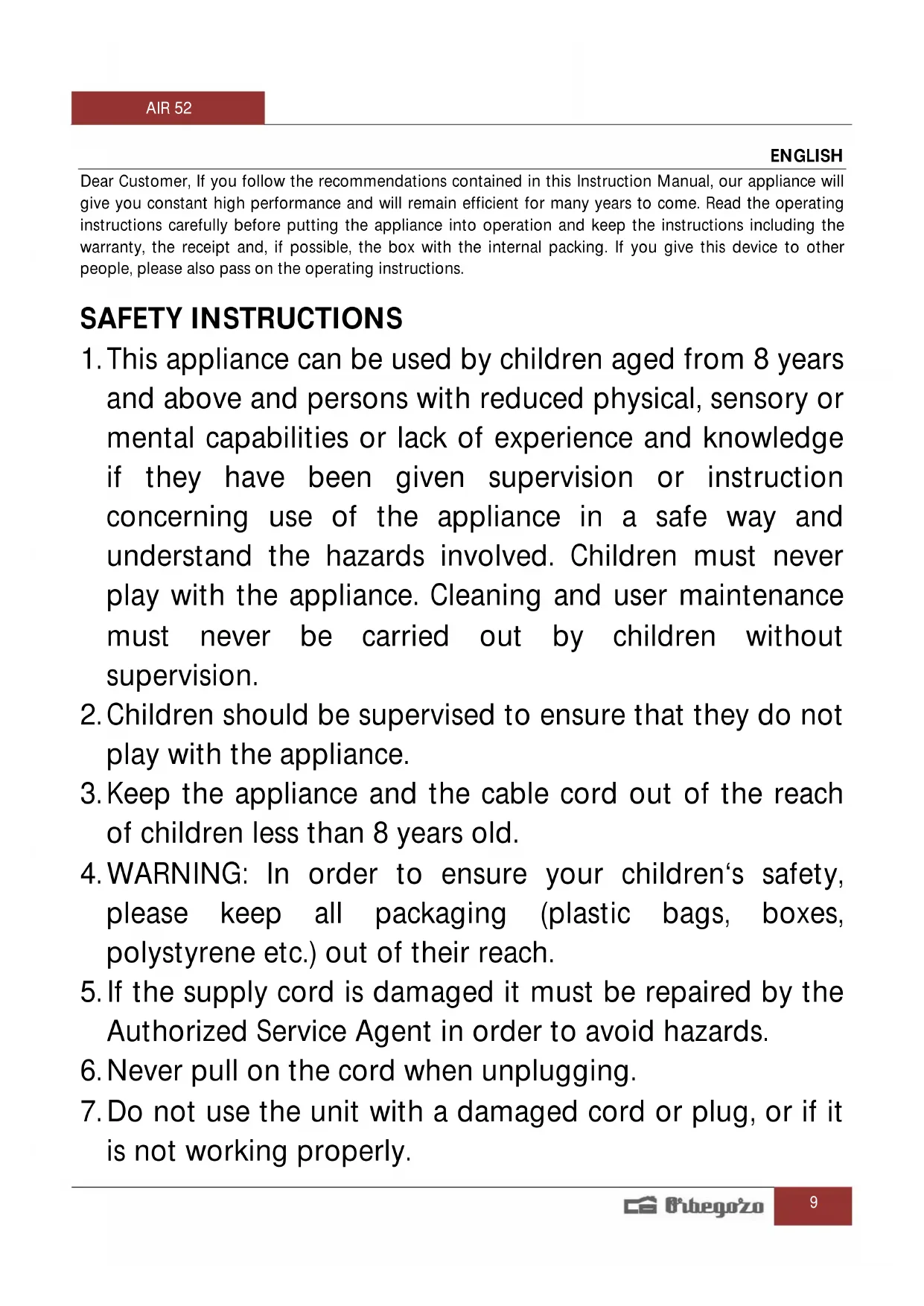 Download the instructions for your Air Conditioning in PDF format for free! Find your manual AIR 52 - Orbegozo and take your electronic device back in hand. On this page are published all the documents necessary for the use of your device. AIR 52 by Orbegozo.