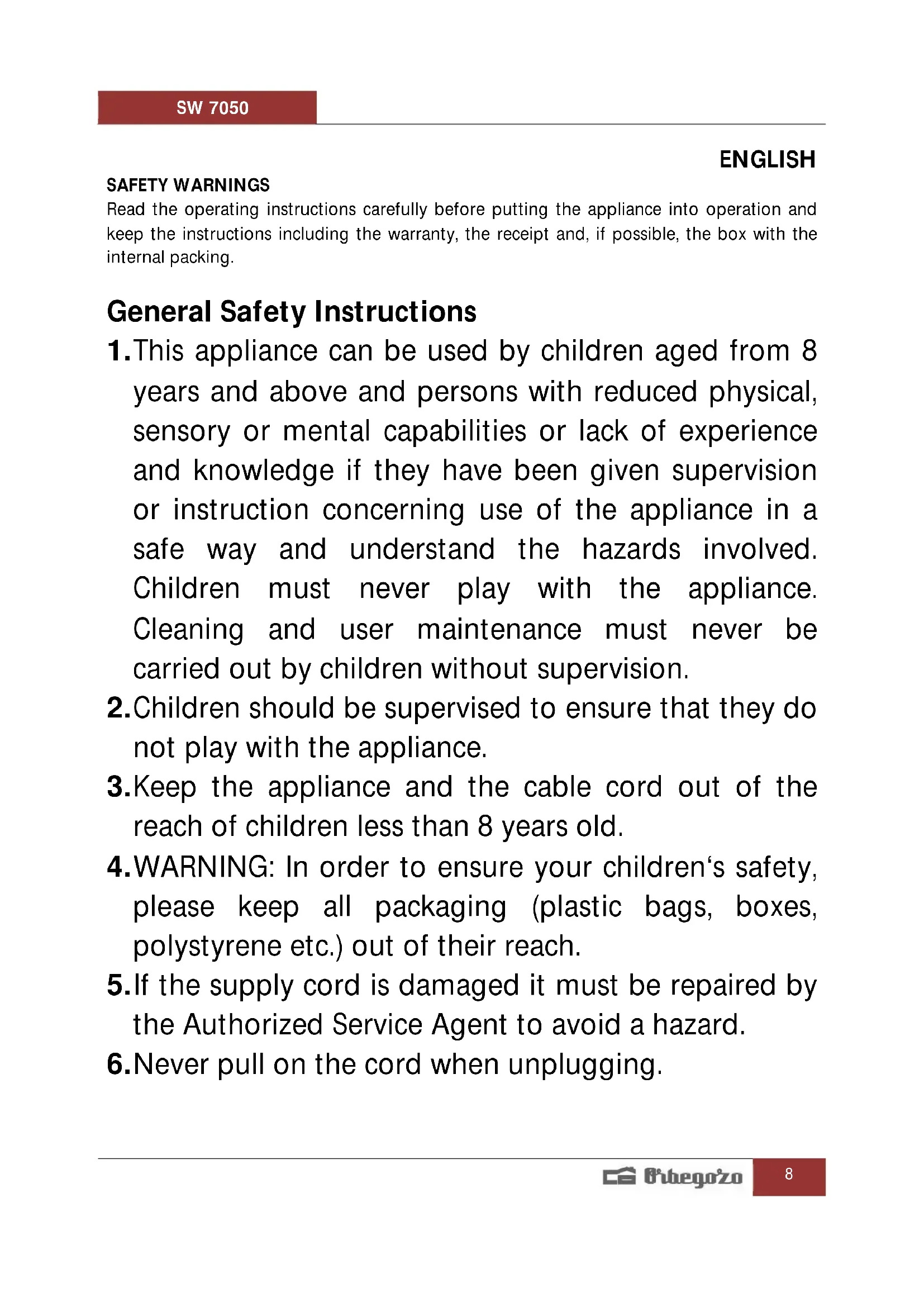 Find the device manual for free SW 7050 Orbegozo in PDF.