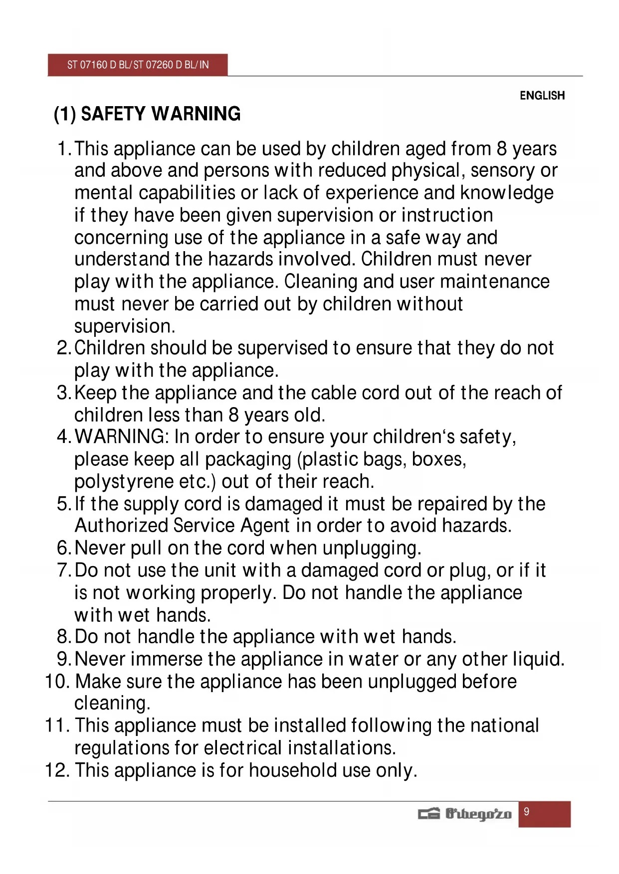 12. This appliance is for household use only.ST 07160 D BL/ST 07260 D BL/IN