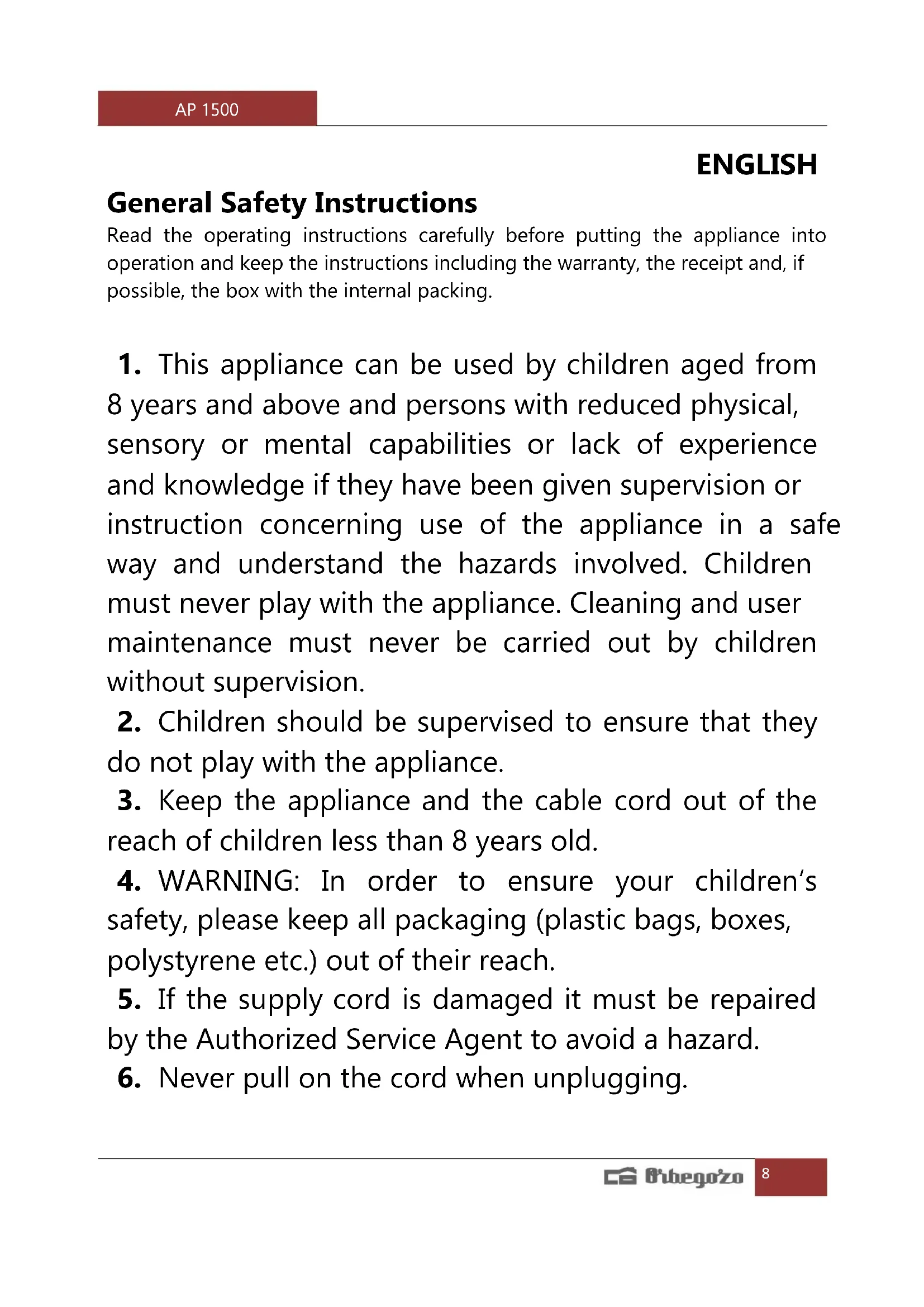 6. Never pull on the cord when unplugging.AP 1500