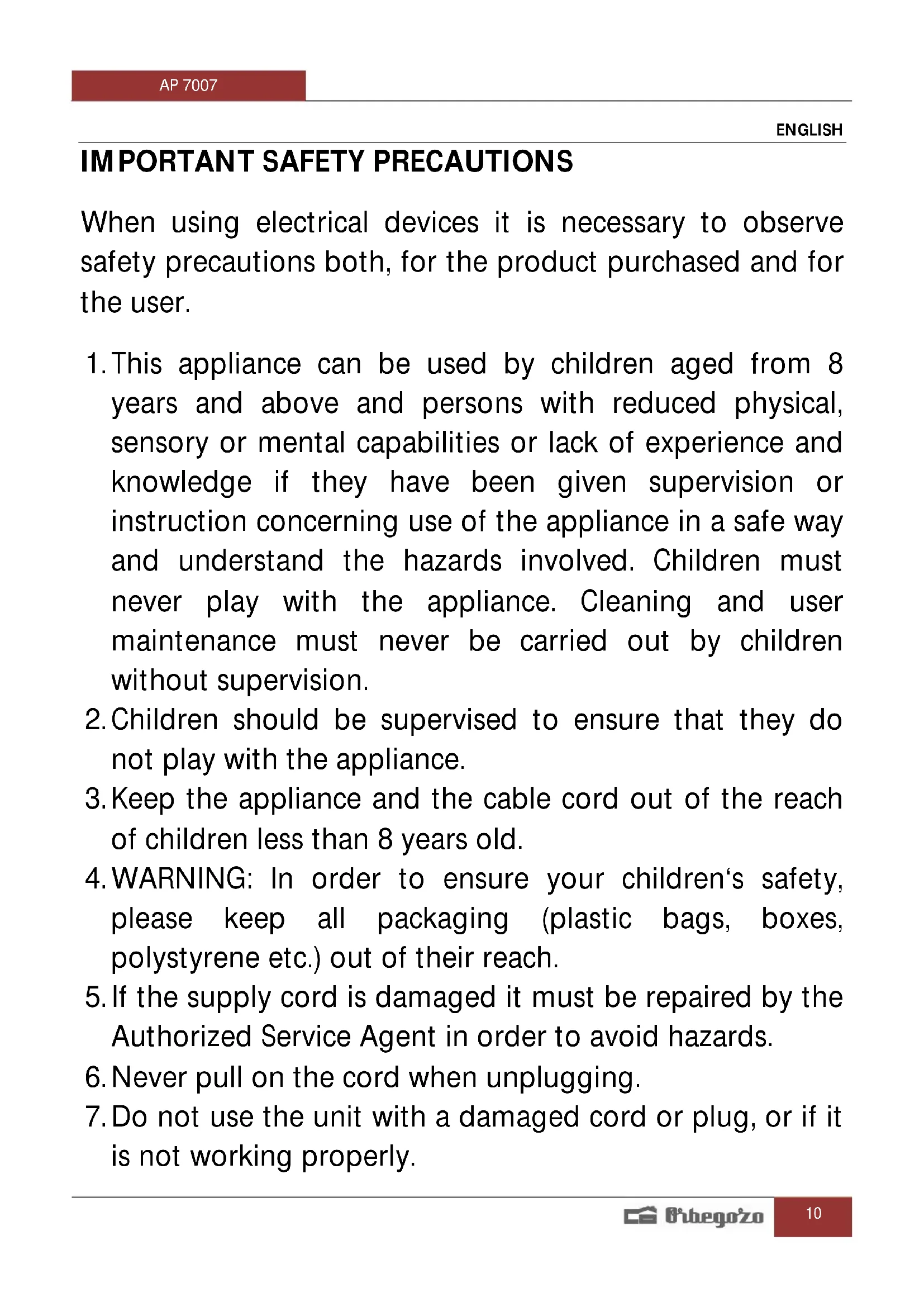 Find the device manual for free AP 7007 Orbegozo in PDF.