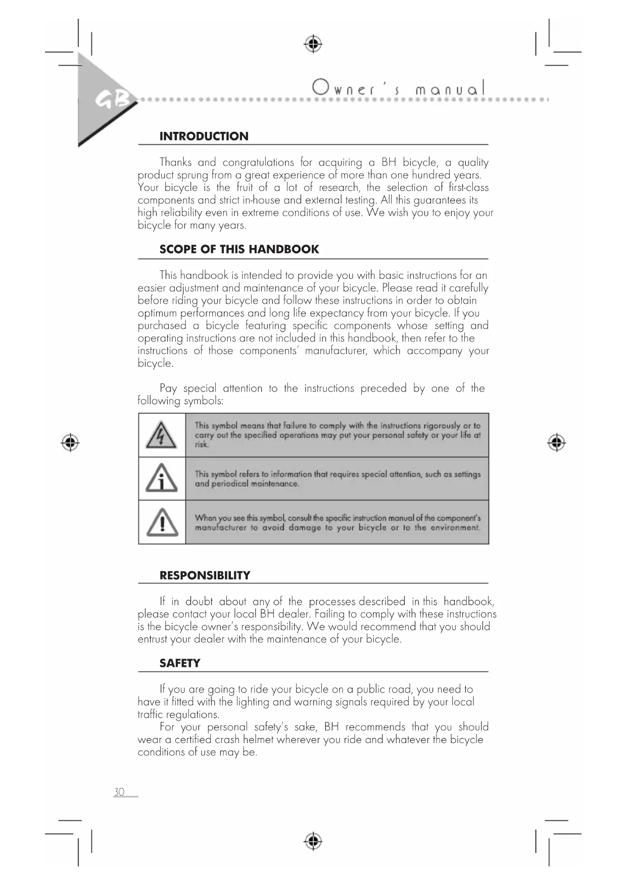 If in doubt about any of the processes described in this handbook, please contact your local BH dealer. Failing to comply with these instructions is the bicycle owner's responsibility. We would recommend that you should entrust your dealer with the maintenance of your bicycle.