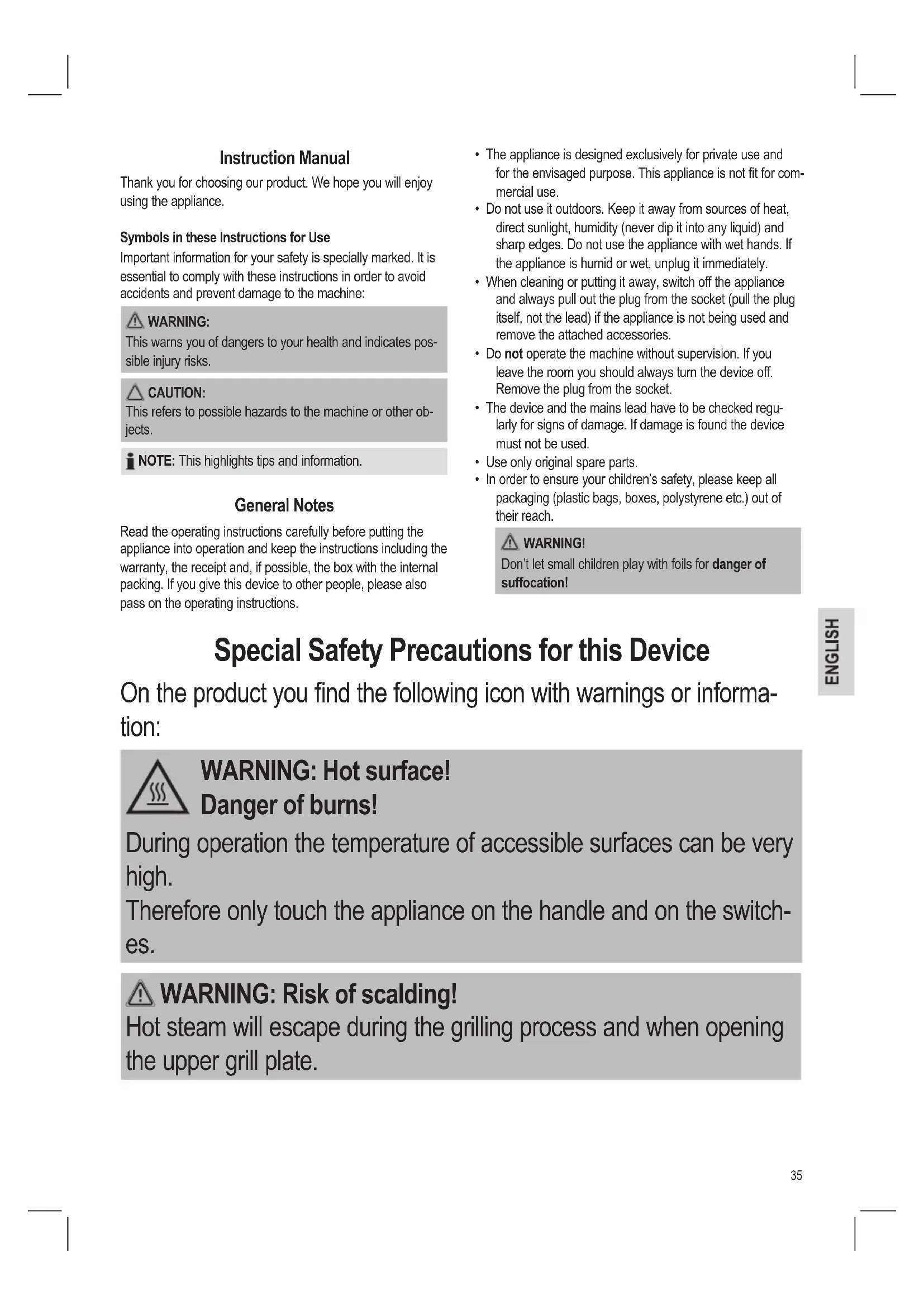 - In order to ensure your children’s safety, please keep all packaging (plastic bags, boxes, polystyrene etc.) out of their reach. WARNING! Don’t let small children play with foils for danger of suffocation! Instruction Manual Thank you for choosing our product. We hope you will enjoy using the appliance. Symbols in these Instructions for Use Important information for your safety is specially marked. It is essential to comply with these instructions in order to avoid accidents and prevent damage to the machine: