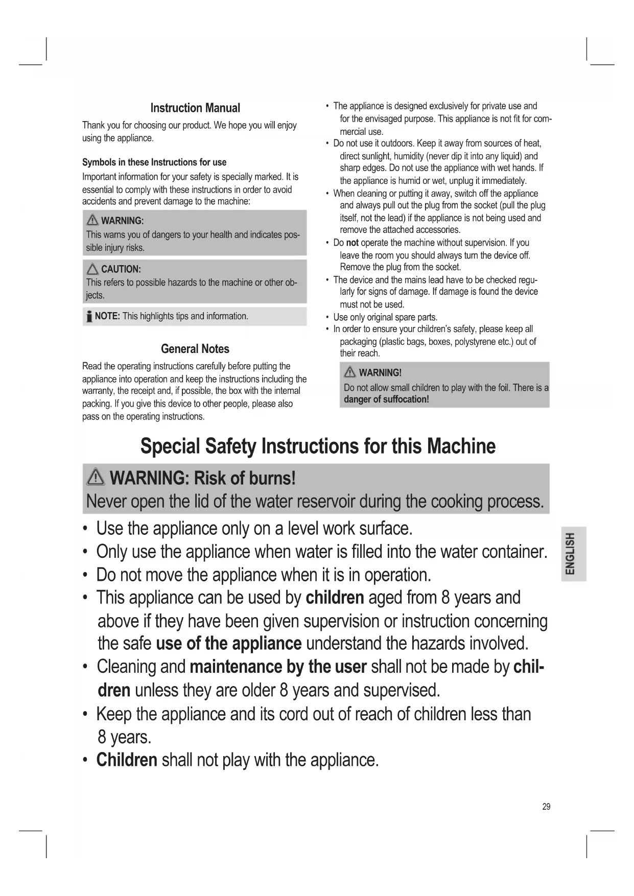 - In order to ensure your children’s safety, please keep all packaging (plastic bags, boxes, polystyrene etc.) out of their reach. WARNING! Do not allow small children to play with the foil. There is a danger of suffocation! Instruction Manual Thank you for choosing our product. We hope you will enjoy using the appliance. Symbols in these Instructions for use Important information for your safety is specially marked. It is essential to comply with these instructions in order to avoid accidents and prevent damage to the machine: