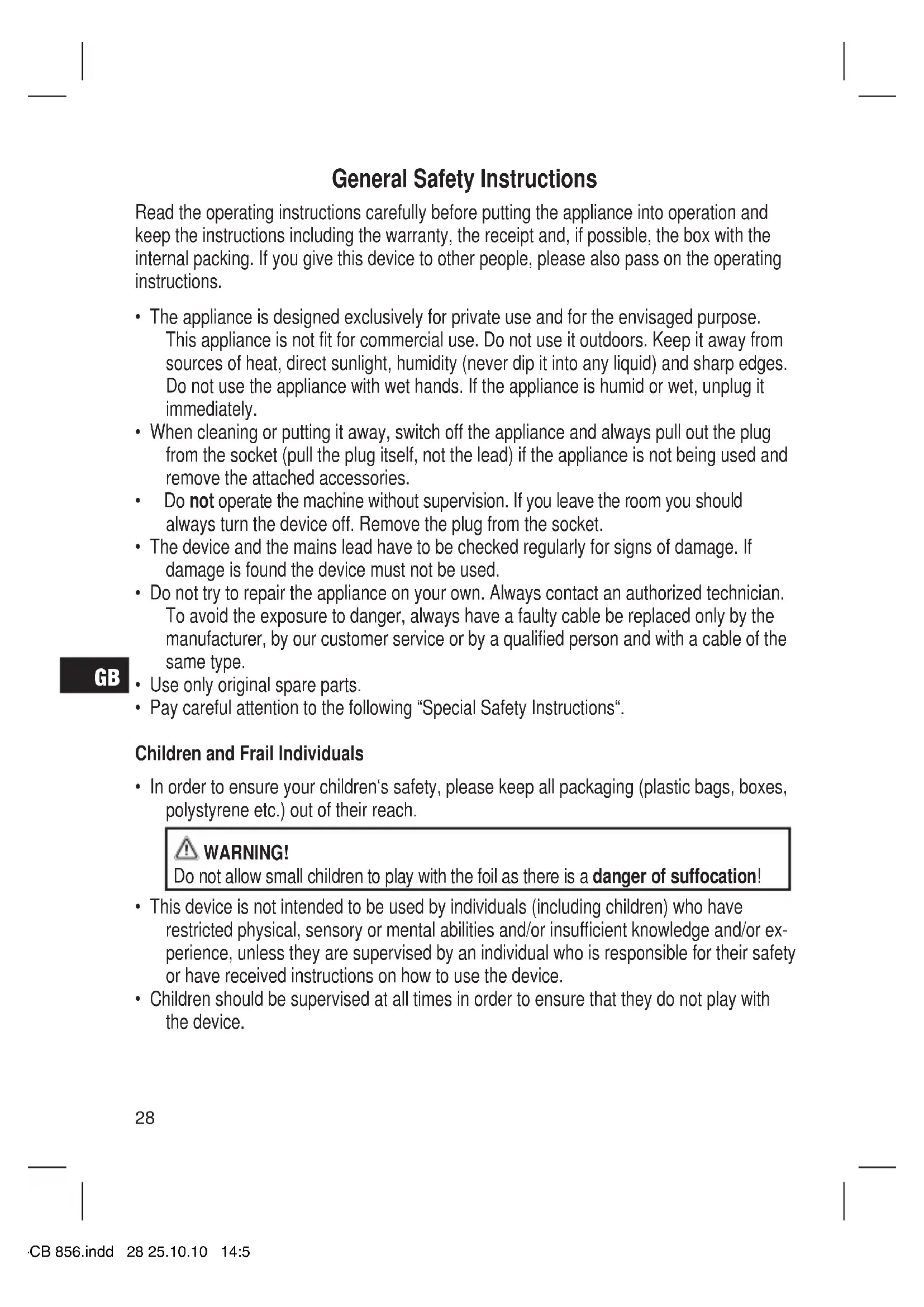 - Children should be supervised at all times in order to ensure that they do not play with the device. 05-CB 856.indd 28 25.10.10 14:52GB