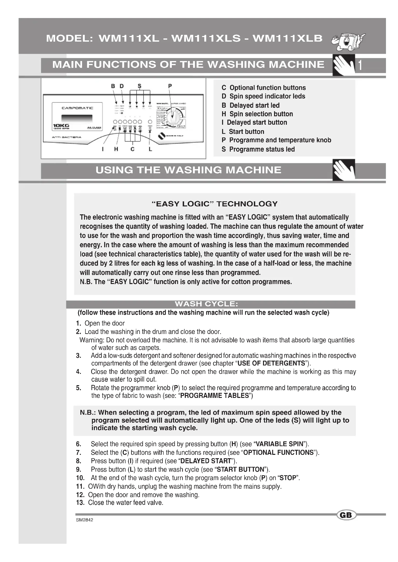 Download the instructions for your Washing machine in PDF format for free! Find your manual WM111 - Campomatic and take your electronic device back in hand. On this page are published all the documents necessary for the use of your device. WM111 by Campomatic.