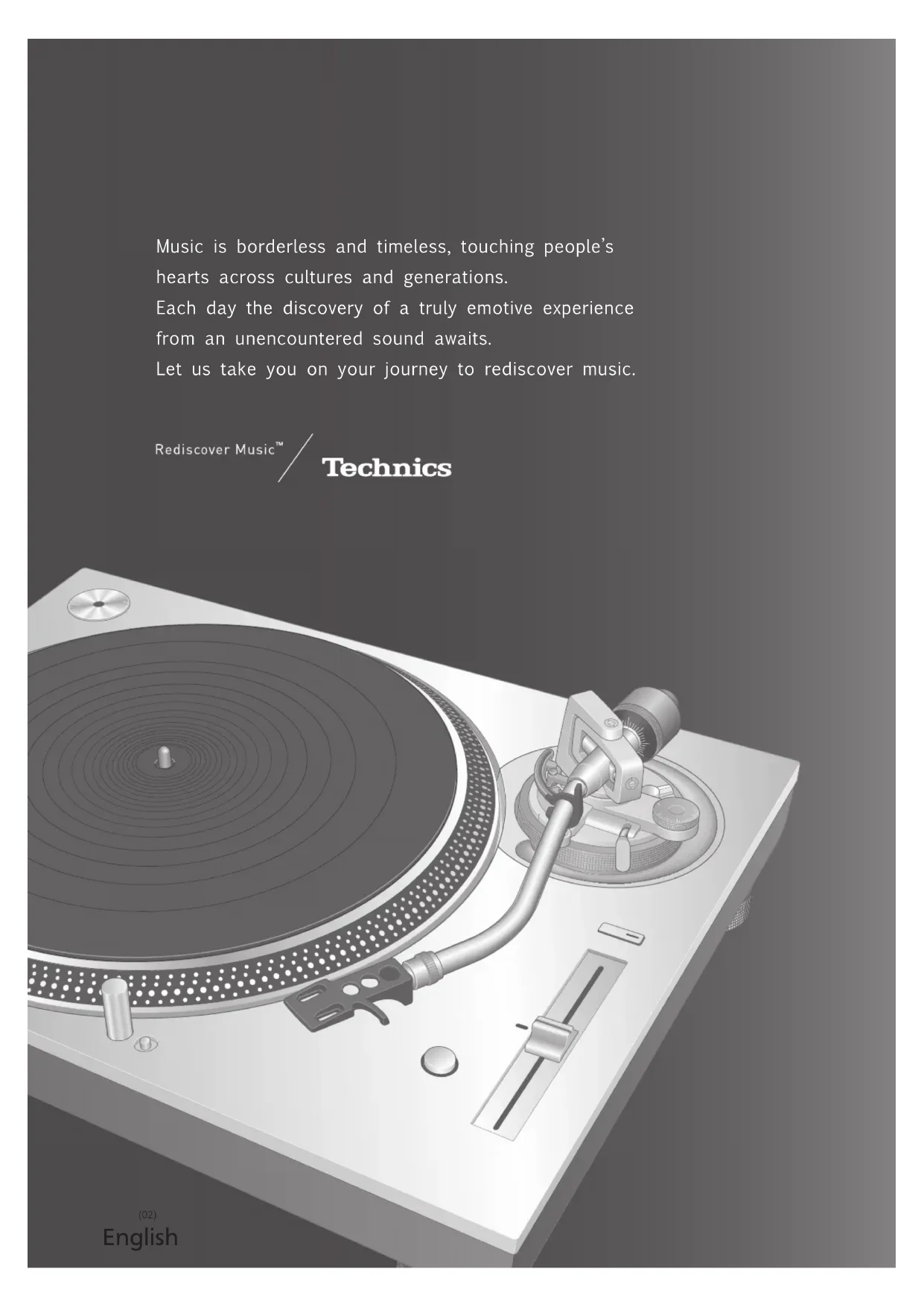 ugi Direct Drive Turntable System Plattenspieler mit Direktantrieb Platine vinyle à entraînement direct Giradischi ad azionamento diretto Sistema de accionamiento directo del plato giratorio Pladespiller med direkte drev Platenspeler met directe aandrijving Skivspelare med direktdrivning Suoravetoinen levysoitinjärjestelmä Gramofon Direct DriveEnglish (02) Music is borderless and timeless, touching people’s hearts across cultures and generations. Each day the discovery of a truly emotive experience from an unencountered sound awaits. Let us take you on your journey to rediscover music.03 Delivering the Ultimate Emotive Musical Experience to All At Technics we understand that the listening experience is not purely about technology but the magical and emotional relationship between people and music. We want people to experience music as it was originally intended and enable them to feel the emotional impact that enthuses and delights them. Through delivering this experience we want to support the development and enjoyment of the world’s many musical cultures. This is our philosophy. With a combination of our love of music and the vast high-end audio experience of the Technics team, we stand committed to building a brand that provides the ultimate emotive musical experience by music lovers, for music lovers. Director Michiko OgawaEnglish (04)