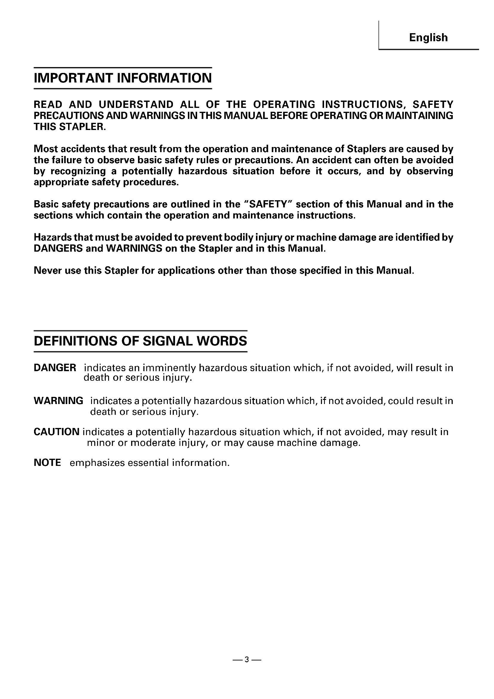 IMPORTANT INFORMATION READ AND UNDERSTAND ALL OF THE OPERATING INSTRUCTIONS, SAFETY PRECAUTIONS AND WARNINGS IN THIS MANUAL BEFORE OPERATING OR MAINTAINING THIS STAPLER. Most accidents that result from the operation and maintenance of Staplers are caused by the failure to observe basic safety rules or precautions. An accident can often be avoided by recognizing a potentially hazardous situation before it occurs, and by observing appropriate safety procedures. Basic safety precautions are outlined in the “SAFETY” section of this Manual and in the sections which contain the operation and maintenance instructions. Hazards that must be avoided to prevent bodily injury or machine damage are identified by DANGERS and WARNINGS on the Stapler and in this Manual. Never use this Stapler for applications other than those specified in this Manual.