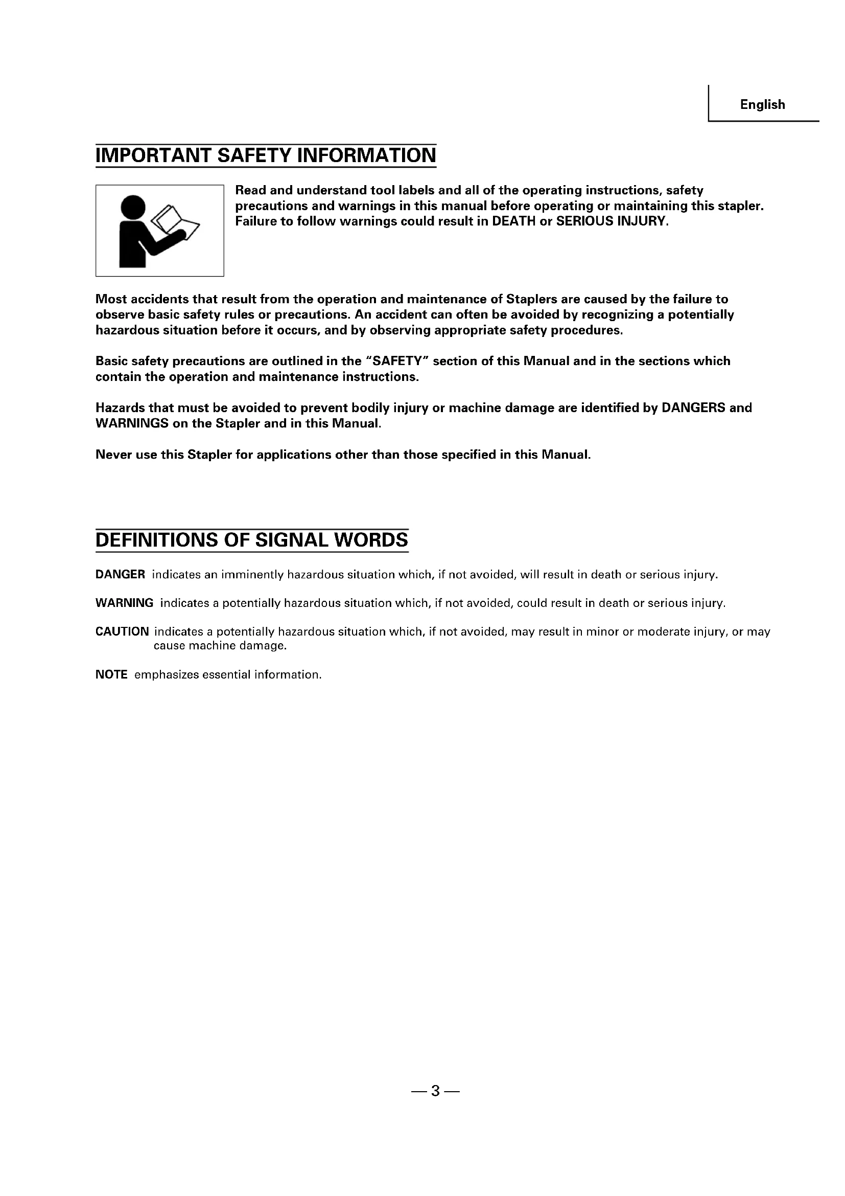 Read and understand tool labels and all of the operating instructions, safety precautions and warnings in this manual before operating or maintaining this stapler. Failure to follow warnings could result in DEATH or SERIOUS INJURY. Most accidents that result from the operation and maintenance of Staplers are caused by the failure to observe basic safety rules or precautions. An accident can often be avoided by recognizing a potentially hazardous situation before it occurs, and by observing appropriate safety procedures. Basic safety precautions are outlined in the “SAFETY” section of this Manual and in the sections which contain the operation and maintenance instructions. Hazards that must be avoided to prevent bodily injury or machine damage are identified by DANGERS and WARNINGS on the Stapler and in this Manual. Never use this Stapler for applications other than those specified in this Manual.