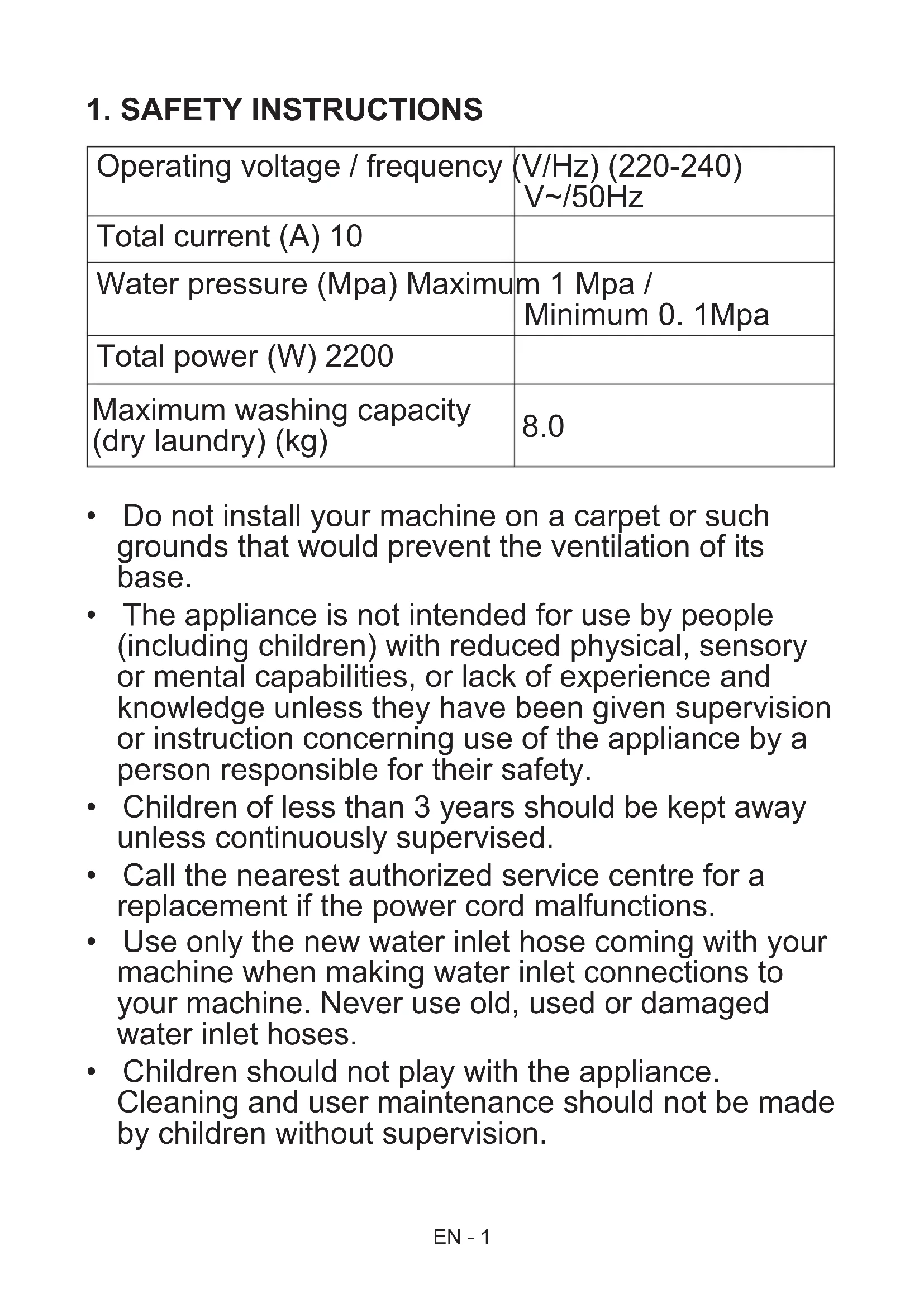 Operating voltage / frequency (V/Hz) (220-240) V~/50Hz Total current (A) 10 Water pressure (Mpa) Maximum 1 Mpa / Minimum 0. 1Mpa Total power (W) 2200 Maximum washing capacity (dry laundry) (kg)