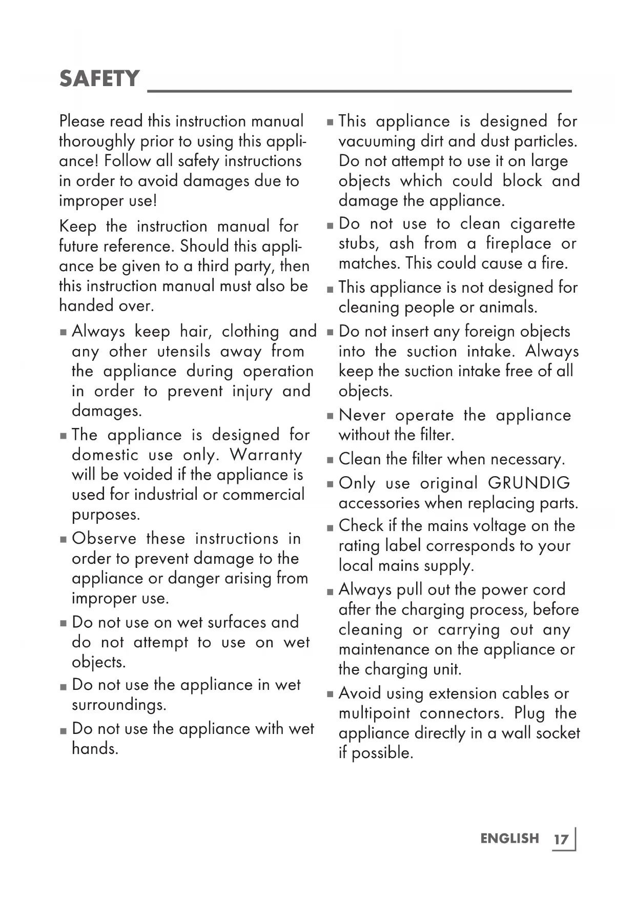 The supply terminals are not to be short-circuited.20 ENGLISH OVERVIEW _______________________________ Dear Customer, Congratulations on the purchase of your new GRUNDIG 2-in1 cordless vacuum cleaner VCP