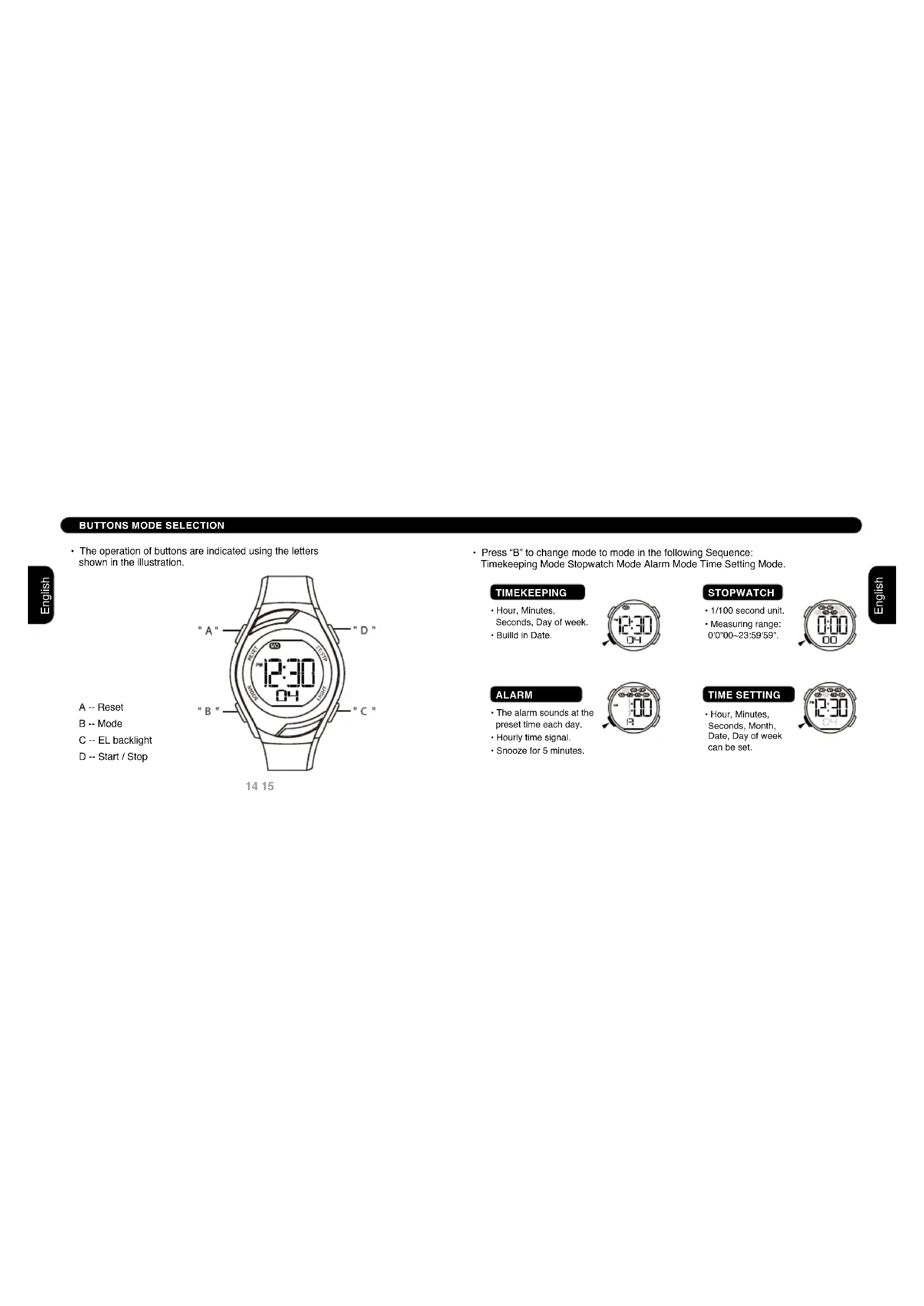 - In the timekeeping mode, press and hold “D” to display the date.18 19 English English ALARMSTOPWATCH A Lap Time Split Time