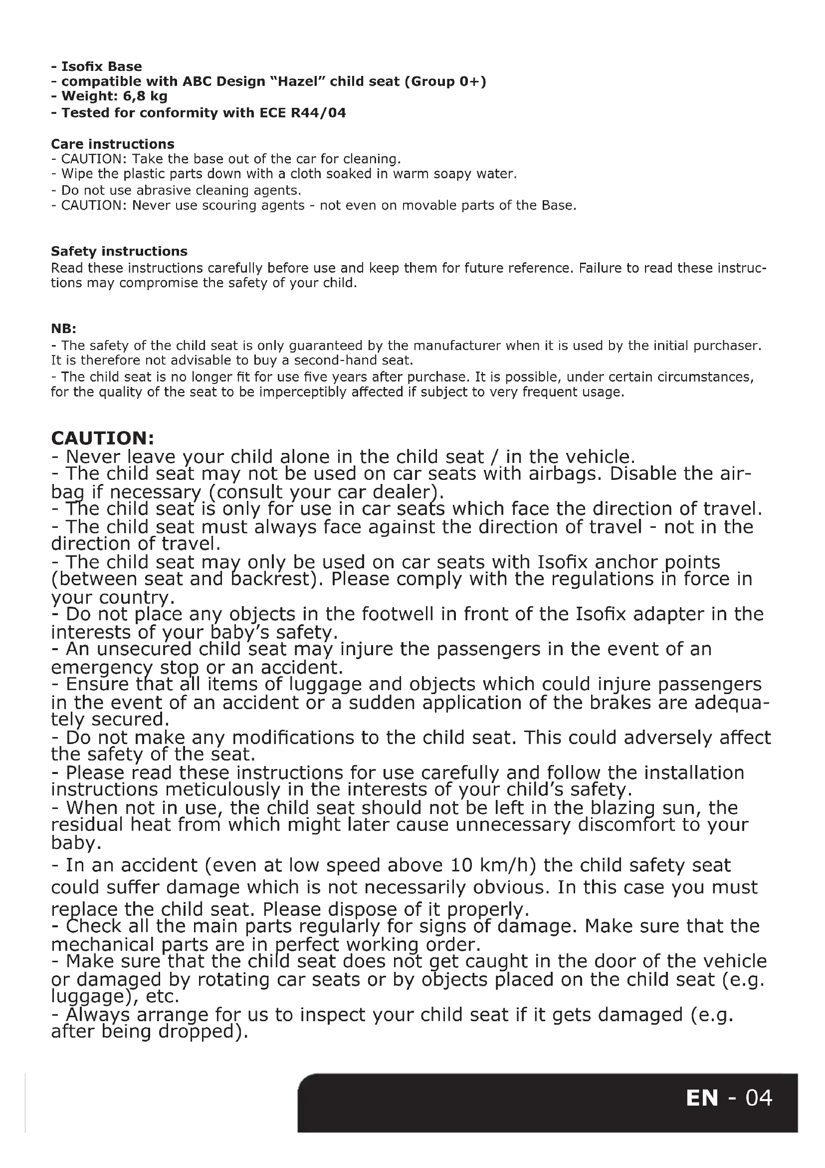 a. Ziehen Sie die Lösevorrichtung (3) auf beiden Seiten bis der Farbindikator rot anzeigt. Nun können Sie die Base von der Isox-Vorrichtung Ihres Fahrzeugs abziehen. b. Ziehen Sie nun die Befestigungsaufnahme nach hinten. Dies geht am einfachsten wenn sie das Plastikteil für die Entriegelung der Befestigungsarme (5) greifen und die Schiene nach hinten ziehen. c. Klappen Sie nun die Befestigungsarme nach hinten, indem Sie die Entriegelung (5) drücken und die Arme nach hinten klappen. d. Drücken Sie nun die Entriegelung des Dämpfungsbügels (4) und klappen Sie diesen ein. e. Drücken Sie den roten Verstellknopf am Standfuß und verstellen diesen auf die kürzeste Position. Klappen Sie den Standfuß anschließend ein.EN - 04 - Isox Base - compatible with ABC Design “Hazel” child seat (Group 0+) - Weight: 6,8 kg - Tested for conformity with ECE R44/04 Care instructions - CAUTION: Take the base out of the car for cleaning. - Wipe the plastic parts down with a cloth soaked in warm soapy water. - Do not use abrasive cleaning agents. - CAUTION: Never use scouring agents - not even on movable parts of the Base. Safety instructions Read these instructions carefully before use and keep them for future reference. Failure to read these instruc- tions may compromise the safety of your child. NB: - The safety of the child seat is only guaranteed by the manufacturer when it is used by the initial purchaser. It is therefore not advisable to buy a second-hand seat. - The child seat is no longer t for use ve years after purchase. It is possible, under certain circumstances, for the quality of the seat to be imperceptibly aected if subject to very frequent usage. CAUTION: - Never leave your child alone in the child seat / in the vehicle. - The child seat may not be used on car seats with airbags. Disable the air- bag if necessary (consult your car dealer). - The child seat is only for use in car seats which face the direction of travel. - The child seat must always face against the direction of travel - not in the direction of travel. - The child seat may only be used on car seats with Isox anchor points (between seat and backrest). Please comply with the regulations in force in your country. - Do not place any objects in the footwell in front of the Isox adapter in the interests of your baby’s safety. - An unsecured child seat may injure the passengers in the event of an emergency stop or an accident. - Ensure that all items of luggage and objects which could injure passengers in the event of an accident or a sudden application of the brakes are adequa- tely secured. - Do not make any modications to the child seat. This could adversely aect the safety of the seat. - Please read these instructions for use carefully and follow the installation instructions meticulously in the interests of your child’s safety. - When not in use, the child seat should not be left in the blazing sun, the residual heat from which might later cause unnecessary discomfort to your baby. - In an accident (even at low speed above 10 km/h) the child safety seat could suer damage which is not necessarily obvious. In this case you must replace the child seat. Please dispose of it properly. - Check all the main parts regularly for signs of damage. Make sure that the mechanical parts are in perfect working order. - Make sure that the child seat does not get caught in the door of the vehicle or damaged by rotating car seats or by objects placed on the child seat (e.g. luggage), etc. - Always arrange for us to inspect your child seat if it gets damaged (e.g. after being dropped).EN - 05
