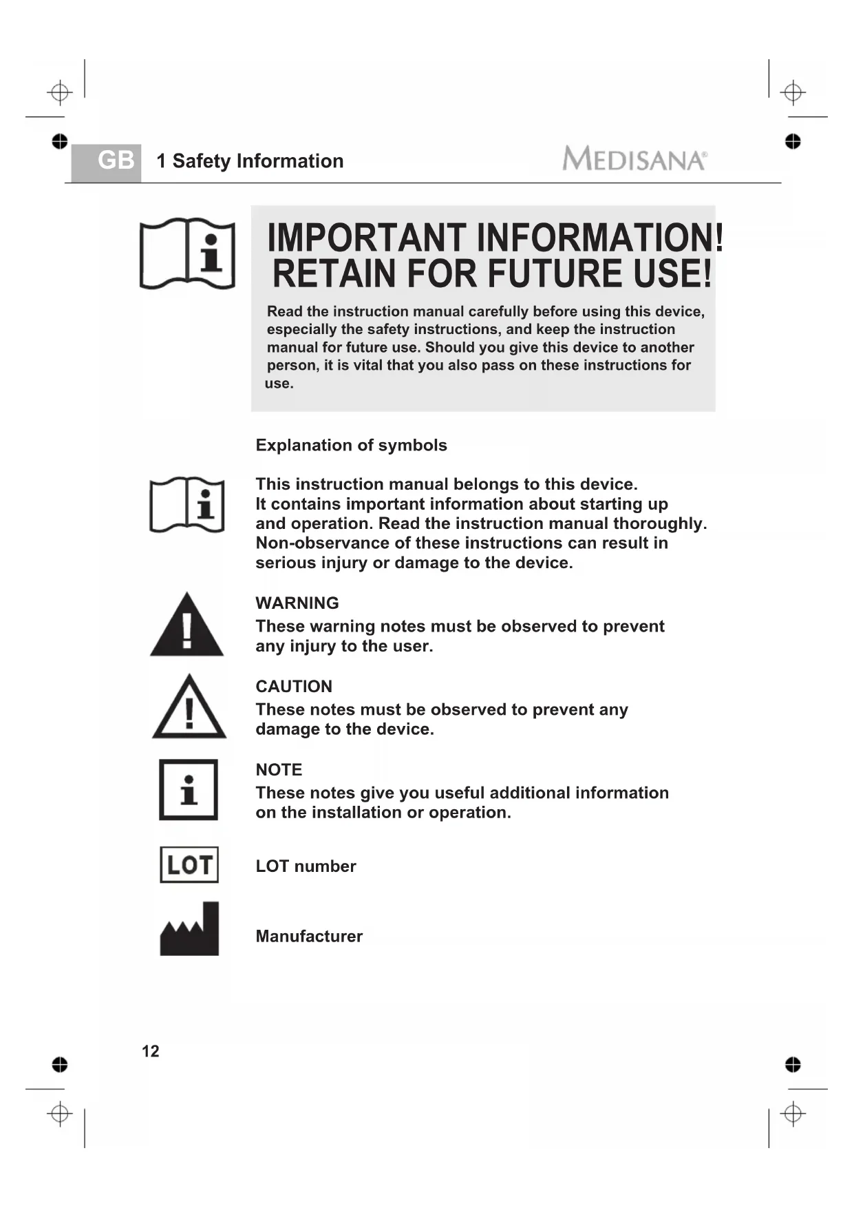 IMPORTANT INFORMATION! RETAIN FOR FUTURE USE! This instruction manual belongs to this device. It contains important information about starting up and operation. Read the instruction manual thoroughly. Non-observance of these instructions can result in serious injury or damage to the device. WARNING These warning notes must be observed to prevent any injury to the user. CAUTION These notes must be observed to prevent any damage to the device. NOTE These notes give you useful additional information on the installation or operation. Manufacturer Read the instruction manual carefully before using this device, especially the safety instructions, and keep the instruction manual for future use. Should you give this device to another person, it is vital that you also pass on these instructions for Explanation of symbols use. LOT numberSafety Information