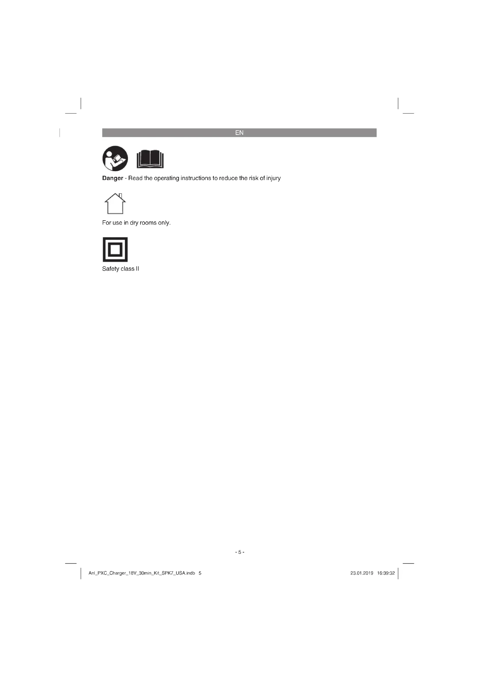 Danger - Read the operating instructions to reduce the risk of injury For use in dry rooms only. Safety class II Anl_PXC_Charger_18V_30min_Kit_SPK7_USA.indb 5Anl_PXC_Charger_18V_30min_Kit_SPK7_USA.indb 5 23.01.2019 16:39:3223.01.2019 16:39:32EN