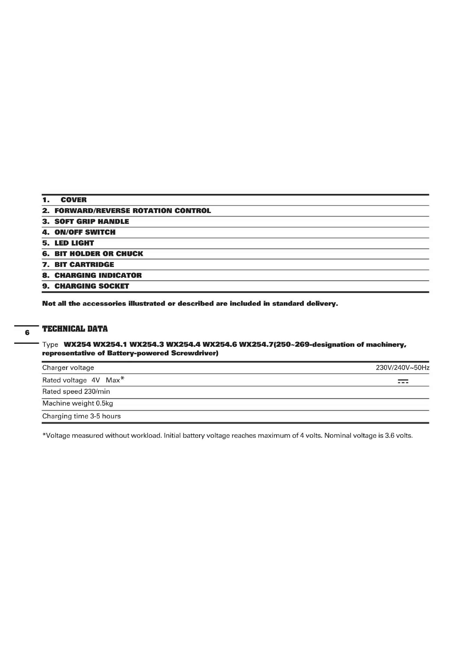 Not all the accessories illustrated or described are included in standard delivery. TECHNICAL DATA Type WX254 WX254.1 WX254.3 WX254.4 WX254.6 WX254.7(250~269-designation of machinery, representative of Battery-powered Screwdriver) Charger voltage 230V/240V~50Hz Rated voltage 4V Max* Rated speed 230/min Machine weight 0.5kg Charging time 3-5 hours *Voltage measured without workload. Initial battery voltage reaches maximum of 4 volts. Nominal voltage is 3.6 volts.7 NOISE INFORMATION A weighted sound pressure L