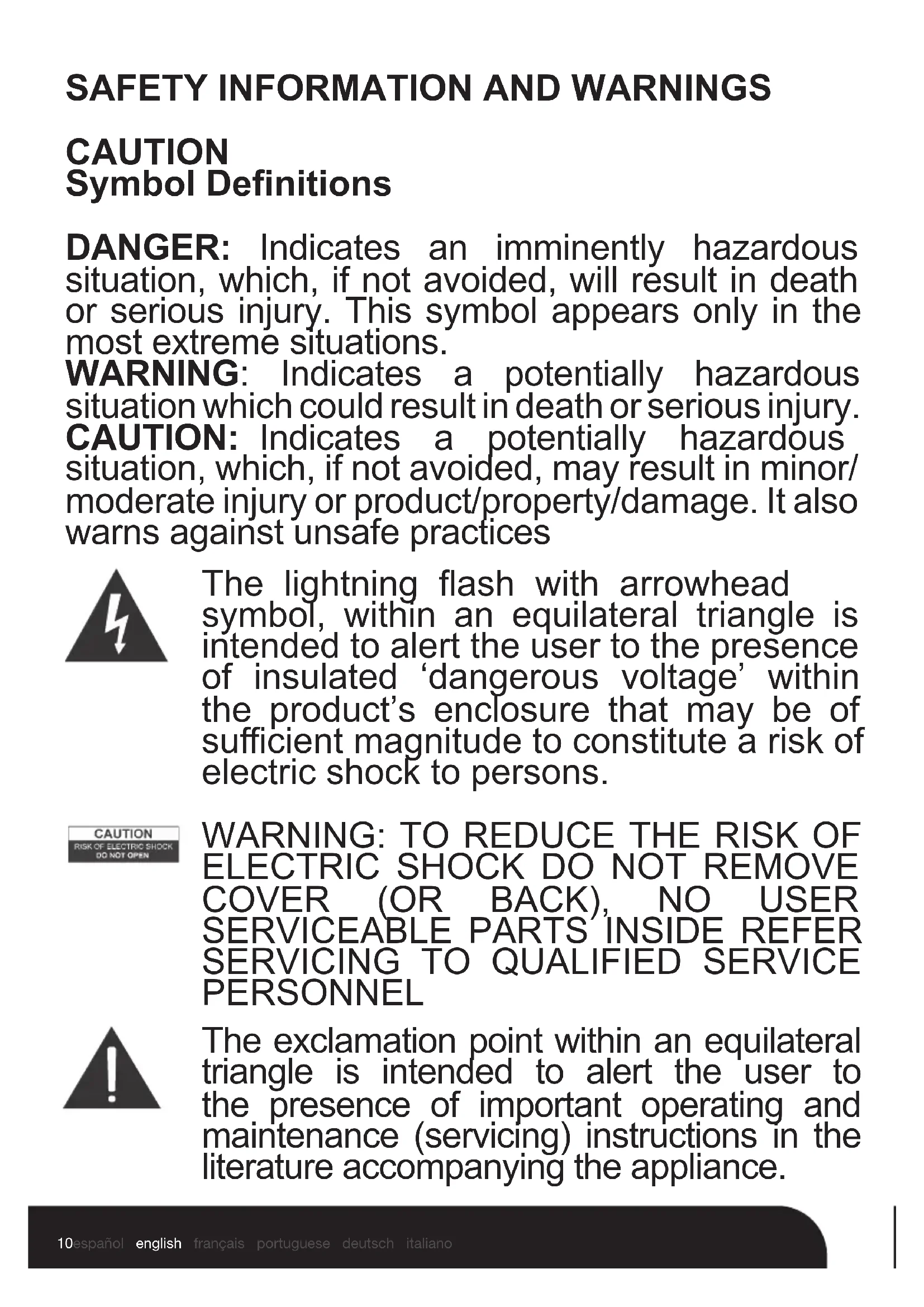 The exclamation point within an equilateral triangle is intended to alert the user to the presence of important operating and maintenance (servicing) instructions in the literature accompanying the appliance.11español english français portuguese deutsch italiano