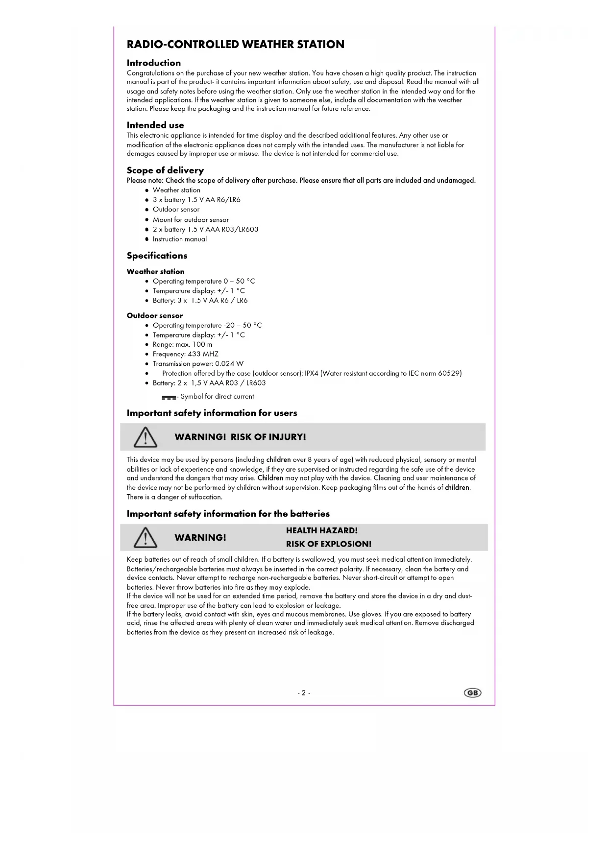 WARNING! HEALTH HAZARD! RISK OF EXPLOSION! Keep batteries out of reach of small children. If a battery is swallowed, you must seek medical attention immediately. Batteries/rechargeable batteries must always be inserted in the correct polarity. If necessary, clean the battery and device contacts. Never attempt to recharge non-rechargeable batteries. Never short-circuit or attempt to open batteries. Never throw batteries into fire as they may explode. If the device will not be used for an extended time period, remove the battery and store the device in a dry and dust- free area. Improper use of the battery can lead to explosion or leakage. If the battery leaks, avoid contact with skin, eyes and mucous membranes. Use gloves. If you are exposed to battery acid, rinse the affected areas with plenty of clean water and immediately seek medical attention. Remove discharged batteries from the device as they present an increased risk of leakage.-