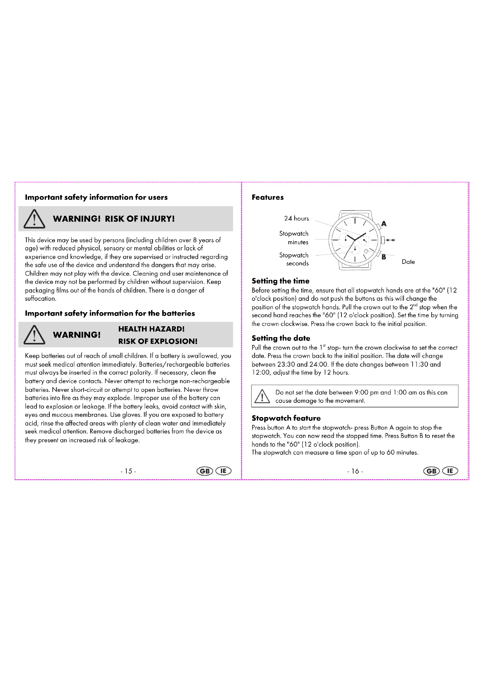 Do not set the date between 9:00 pm and 1:00 am as this can cause damage to the movement. Stopwatch feature Press button A to start the stopwatch- press Button A again to stop the stopwatch. You can now read the stopped time. Press Button B to reset the hands to the "60" (12 o'clock position). The stopwatch can measure a time span of up to 60 minutes. 24 hours Stopwatch