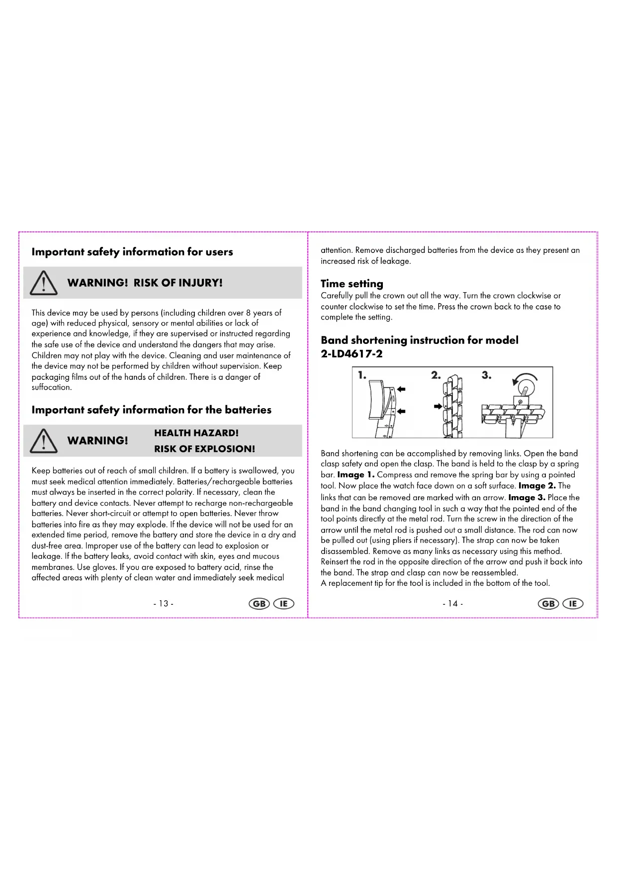 attention. Remove discharged batteries from the device as they present an increased risk of leakage. Time setting Carefully pull the crown out all the way. Turn the crown clockwise or counter clockwise to set the time. Press the crown back to the case to complete the setting. Band shortening instruction for model 2-LD4617-2