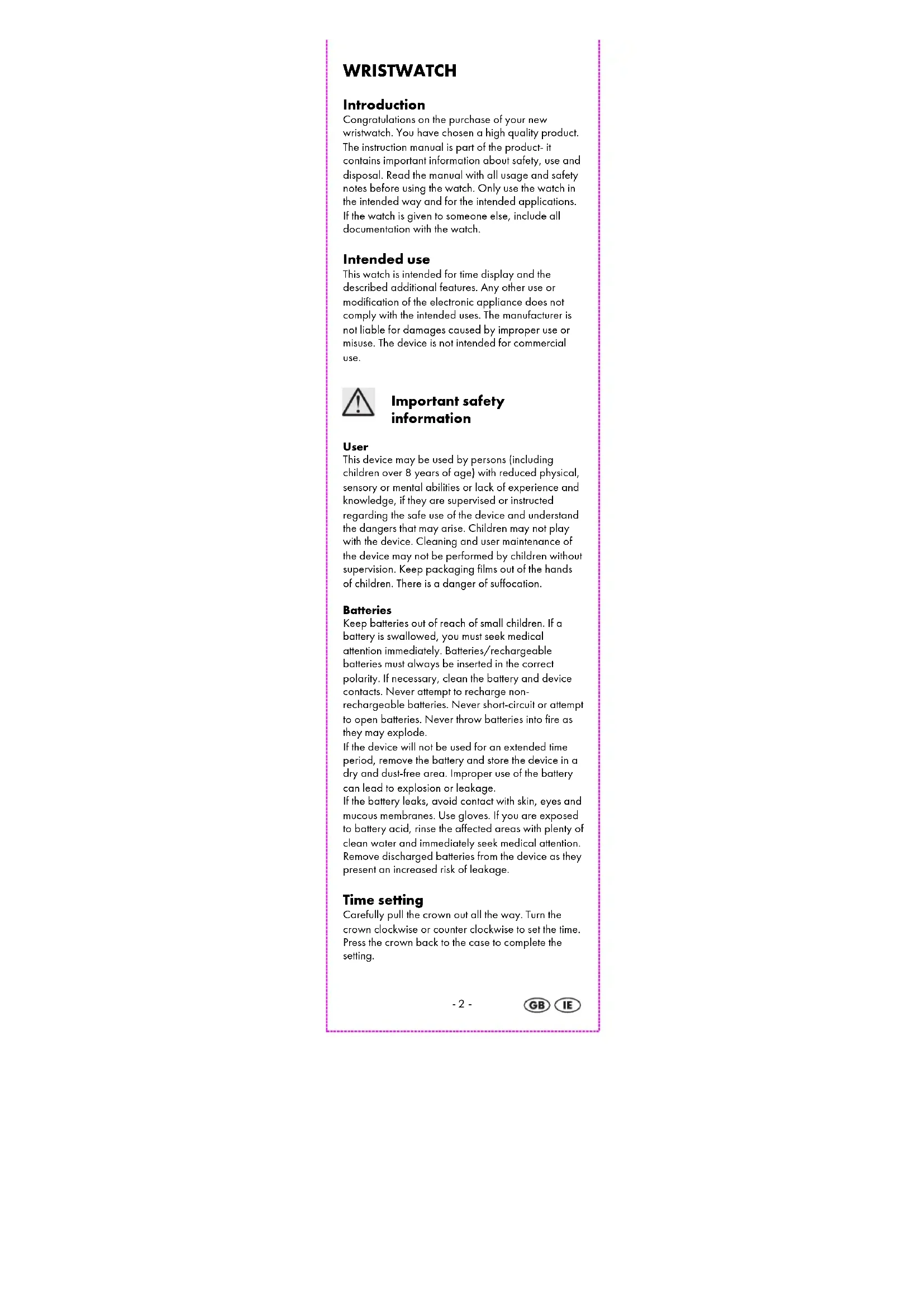 Important safety information User This device may be used by persons (including children over 8 years of age) with reduced physical, sensory or mental abilities or lack of experience and knowledge, if they are supervised or instructed regarding the safe use of the device and understand the dangers that may arise. Children may not play with the device. Cleaning and user maintenance of the device may not be performed by children without supervision. Keep packaging films out of the hands of children. There is a danger of suffocation. Batteries Keep batteries out of reach of small children. If a battery is swallowed, you must seek medical attention immediately. Batteries/rechargeable batteries must always be inserted in the correct polarity. If necessary, clean the battery and device contacts. Never attempt to recharge non- rechargeable batteries. Never short-circuit or attempt to open batteries. Never throw batteries into fire as they may explode. If the device will not be used for an extended time period, remove the battery and store the device in a dry and dust-free area. Improper use of the battery can lead to explosion or leakage. If the battery leaks, avoid contact with skin, eyes and mucous membranes. Use gloves. If you are exposed to battery acid, rinse the affected areas with plenty of clean water and immediately seek medical attention. Remove discharged batteries from the device as they present an increased risk of leakage. Time setting Carefully pull the crown out all the way. Turn the crown clockwise or counter clockwise to set the time. Press the crown back to the case to complete the setting.-