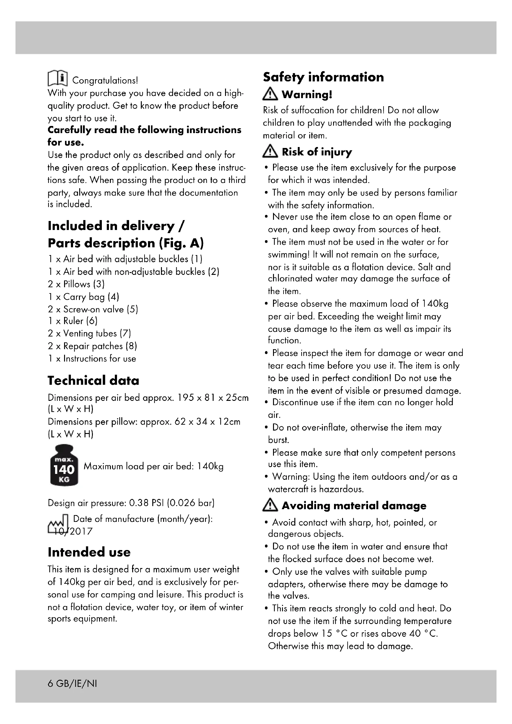 - Please observe the maximum load of 140kg per air bed. Exceeding the weight limit may cause damage to the item as well as impair its function.