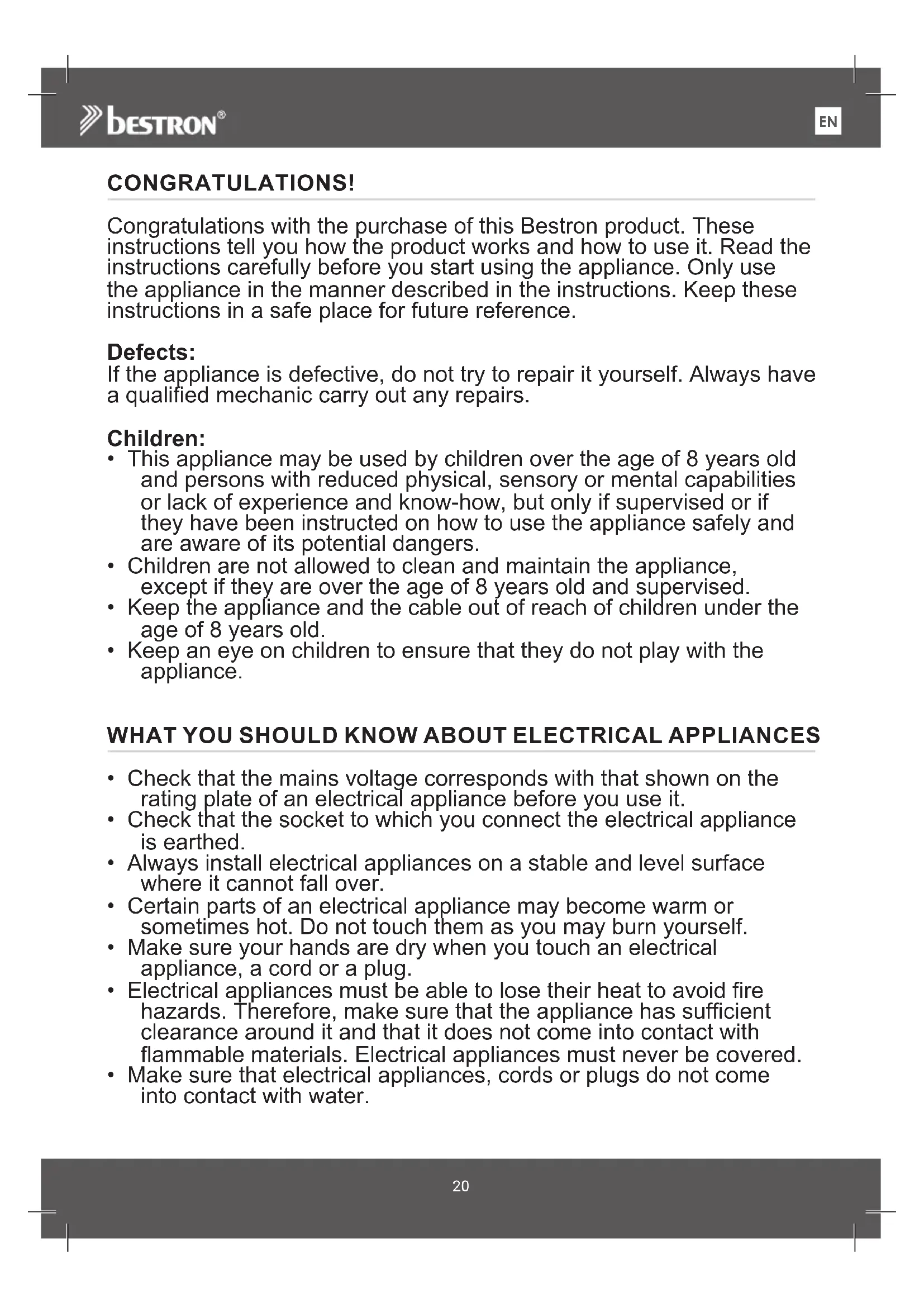 CONGRATULATIONS! Congratulations with the purchase of this Bestron product. These instructions tell you how the product works and how to use it. Read the instructions carefully before you start using the appliance. Only use the appliance in the manner described in the instructions. Keep these instructions in a safe place for future reference. Defects: If the appliance is defective, do not try to repair it yourself. Always have a qualified mechanic carry out any repairs. Children: