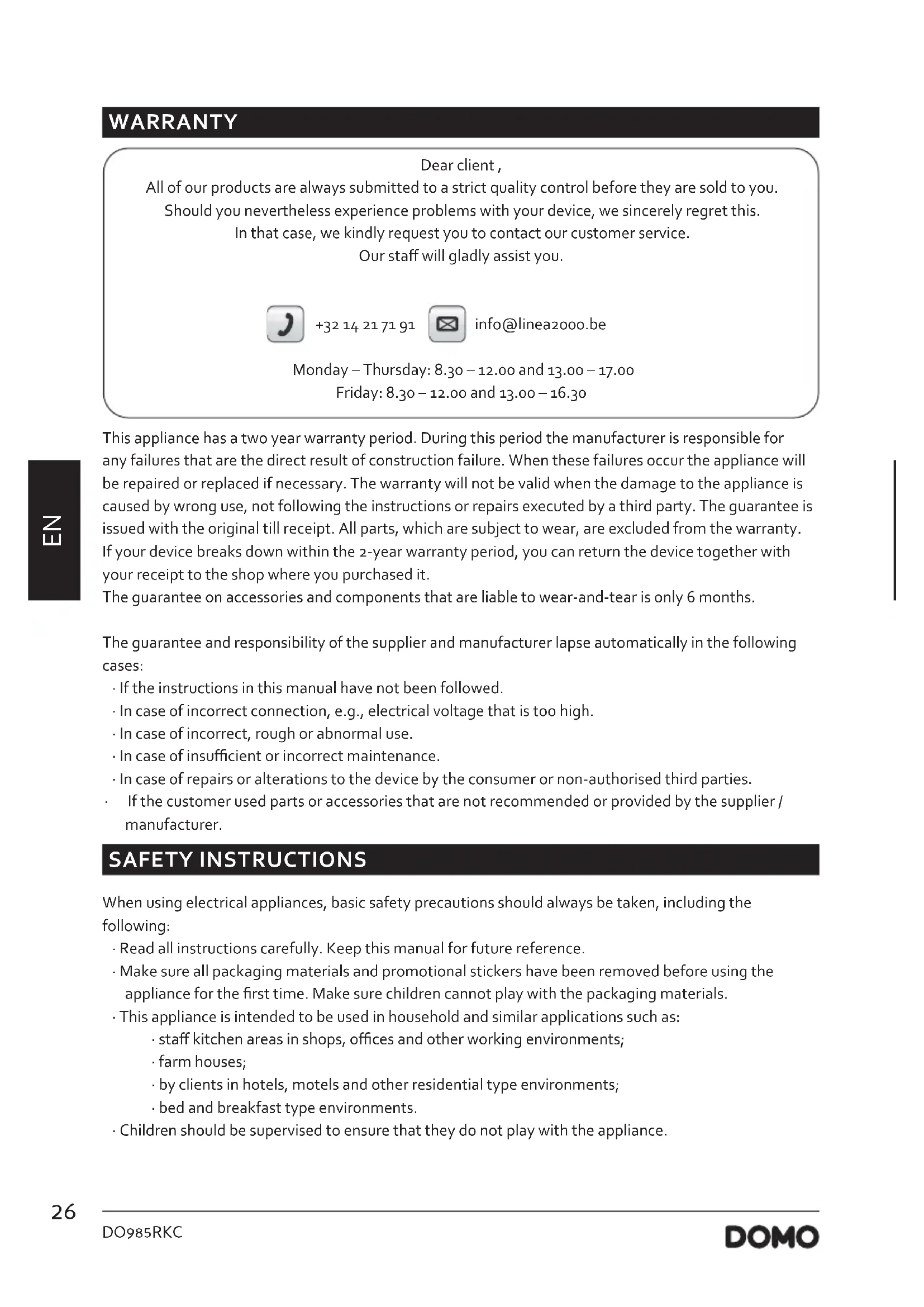 This appliance has a two year warranty period. During this period the manufacturer is responsible for any failures that are the direct result of construction failure. When these failures occur the appliance will be repaired or replaced if necessary. The warranty will not be valid when the damage to the appliance is caused by wrong use, not following the instructions or repairs executed by a third party. The guarantee is issued with the original till receipt. All parts, which are subject to wear, are excluded from the warranty. If your device breaks down within the 2-year warranty period, you can return the device together with your receipt to the shop where you purchased it.