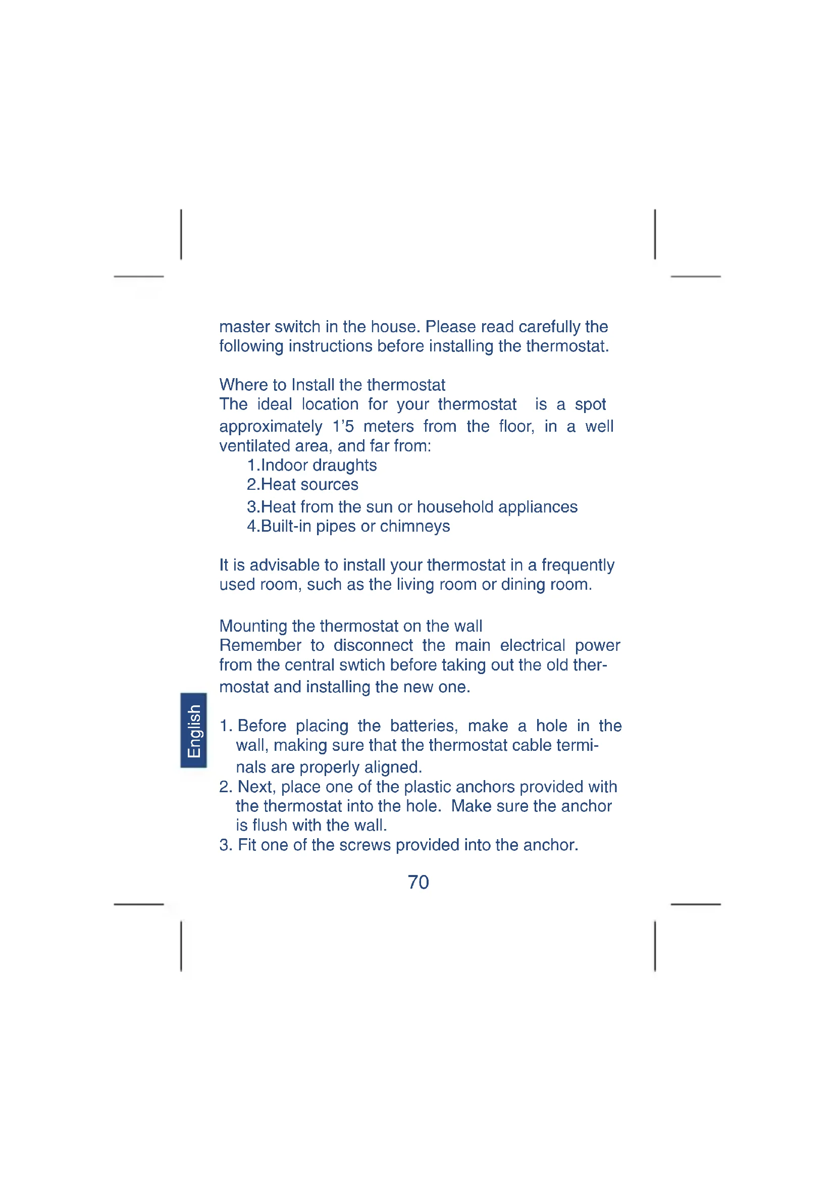 English master switch in the house. Please read carefully the following instructions before installing the thermostat. Where to Install the thermostat The ideal location for your thermostat is a spot approximately 1’5 meters from the floor, in a well ventilated area, and far from: 1.Indoor draughts 2.Heat sources 3.Heat from the sun or household appliances 4.Built-in pipes or chimneys It is advisable to install your thermostat in a frequently used room, such as the living room or dining room. Mounting the thermostat on the wall Remember to disconnect the main electrical power from the central swtich before taking out the old ther- mostat and installing the new one.