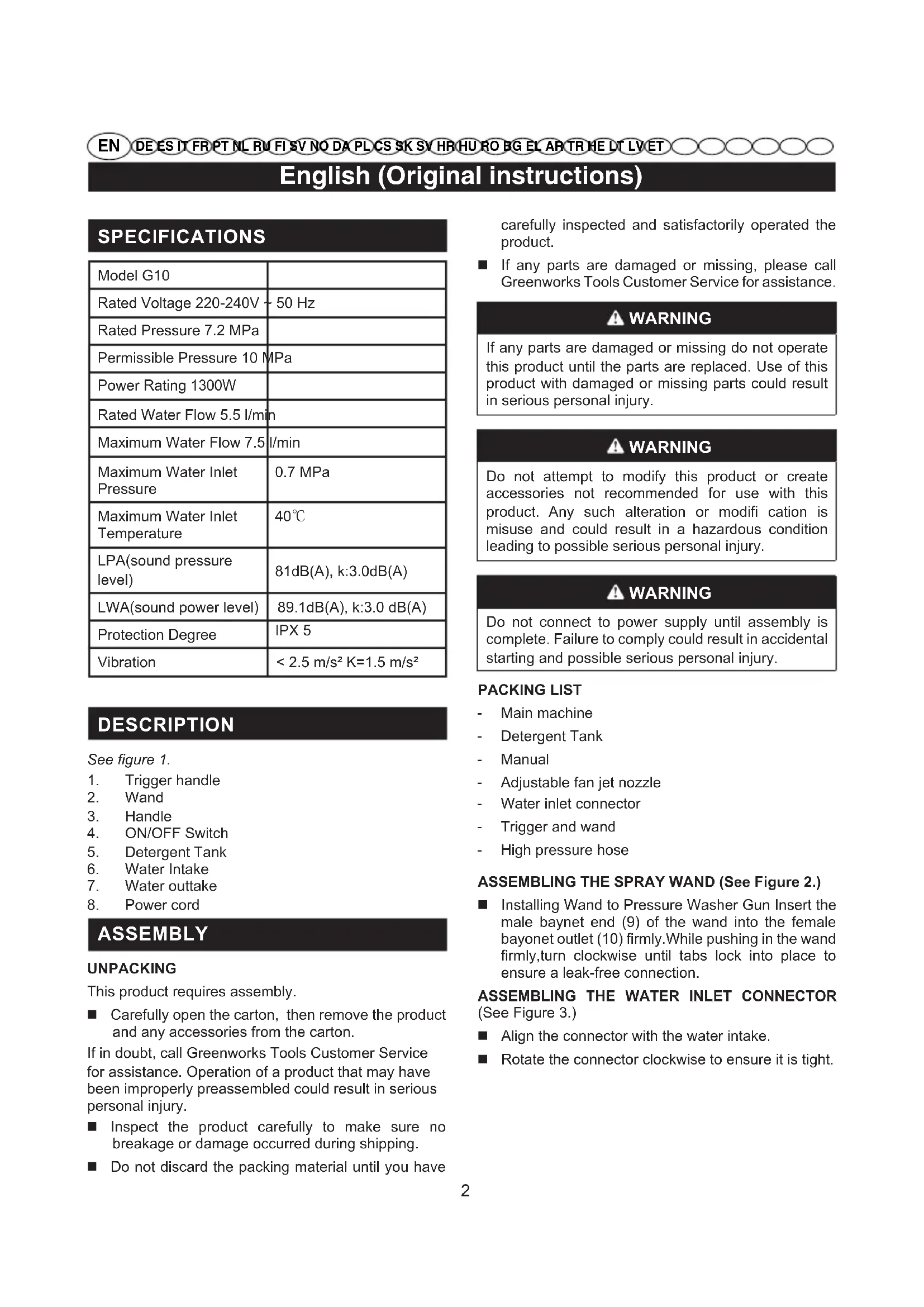 Download the instructions for your Pressure washer in PDF format for free! Find your manual G10 - GREENWORKS and take your electronic device back in hand. On this page are published all the documents necessary for the use of your device. G10 by GREENWORKS.