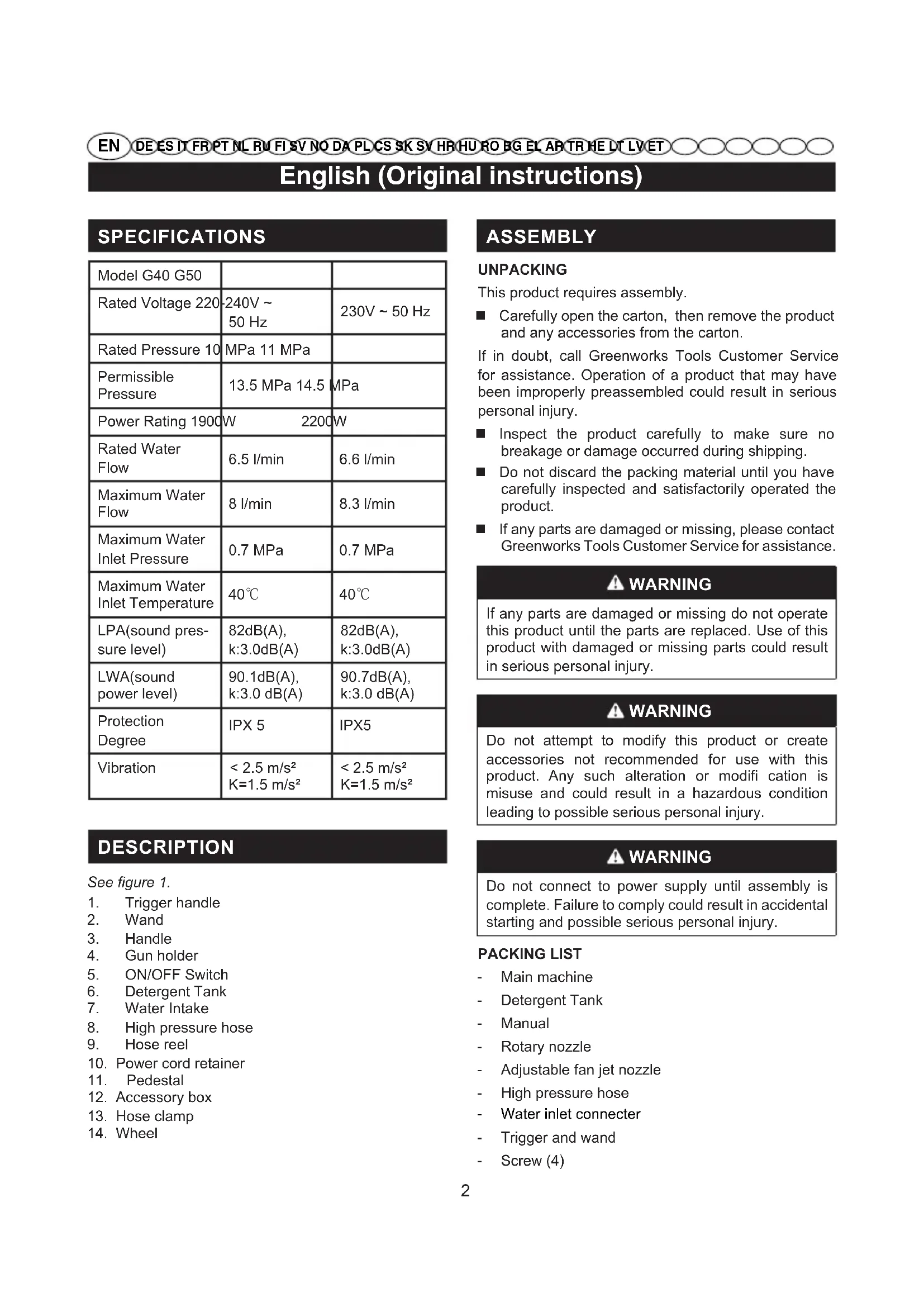 ASSEMBLY UNPACKING This product requires assembly. Carefully open the carton, then remove the product and any accessories from the carton. If in doubt, call Greenworks Tools Customer Service for assistance. Operation of a product that may have been improperly preassembled could result in serious personal injury. Inspect the product carefully to make sure no breakage or damage occurred during shipping. Do not discard the packing material until you have carefully inspected and satisfactorily operated the product. If any parts are damaged or missing, please contact Greenworks Tools Customer Service for assistance. WARNING If any parts are damaged or missing do not operate this product until the parts are replaced. Use of this product with damaged or missing parts could result in serious personal injury. WARNING Do not attempt to modify this product or create accessories not recommended for use with this product. Any such alteration or modifi cation is misuse and could result in a hazardous condition leading to possible serious personal injury. WARNING Do not connect to power supply until assembly is complete. Failure to comply could result in accidental starting and possible serious personal injury. PACKING LIST - Main machine - Detergent Tank - Manual - Rotary nozzle - Adjustable fan jet nozzle - High pressure hose - Water inlet connecter - Trigger and wand - Screw (4)English (Original instructions)