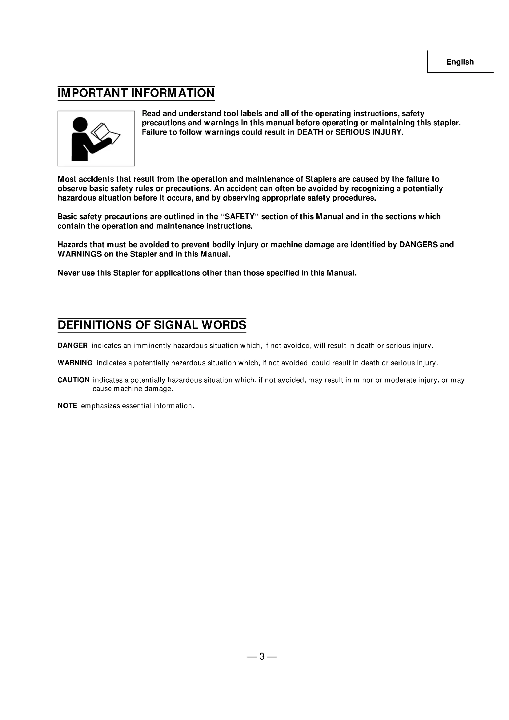 Página Página— 3 — English IMPORTANT INFORMATION Read and understand tool labels and all of the operating instructions, safety precautions and warnings in this manual before operating or maintaining this stapler. Failure to follow warnings could result in DEATH or SERIOUS INJURY. Most accidents that result from the operation and maintenance of Staplers are caused by the failure to observe basic safety rules or precautions. An accident can often be avoided by recognizing a potentially hazardous situation before it occurs, and by observing appropriate safety procedures. Basic safety precautions are outlined in the “SAFETY” section of this Manual and in the sections which contain the operation and maintenance instructions. Hazards that must be avoided to prevent bodily injury or machine damage are identified by DANGERS and WARNINGS on the Stapler and in this Manual. Never use this Stapler for applications other than those specified in this Manual.