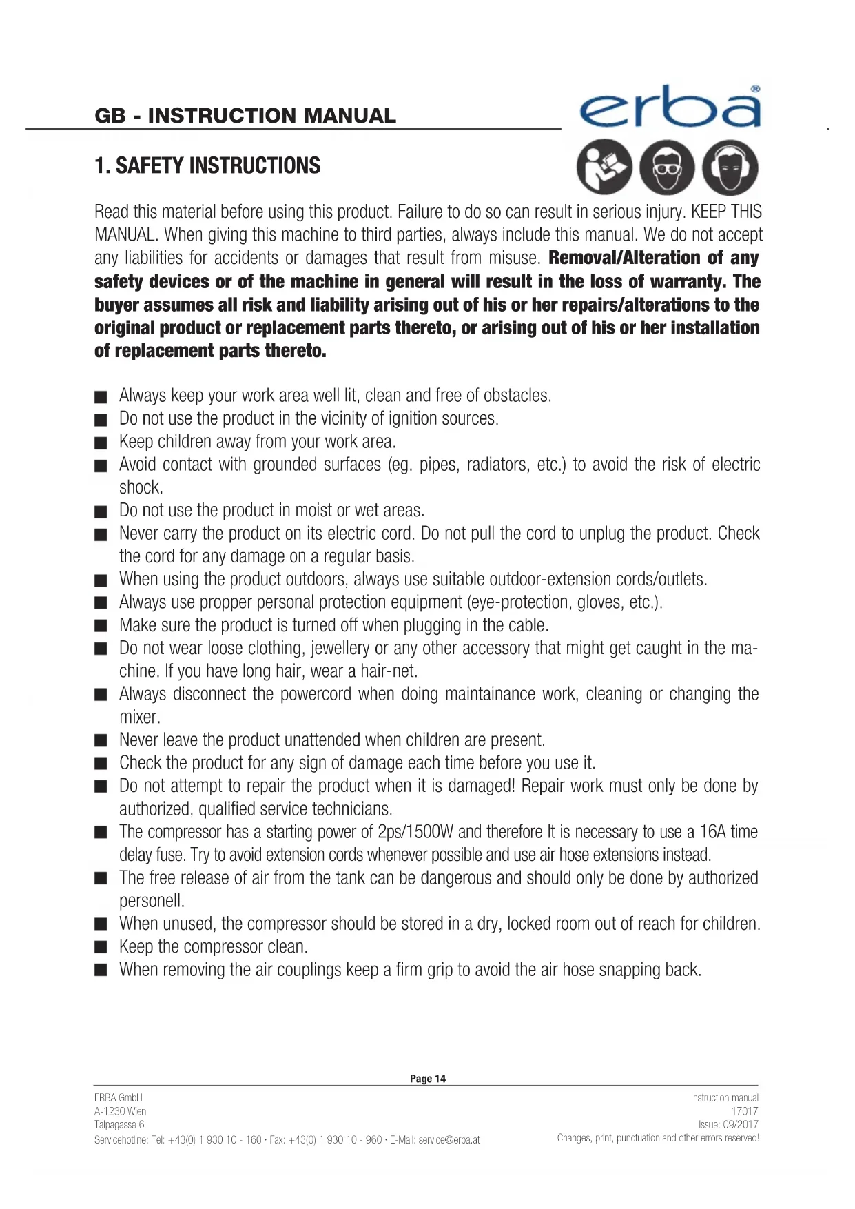 Download the instructions for your Compressor in PDF format for free! Find your manual 17017 - Erba and take your electronic device back in hand. On this page are published all the documents necessary for the use of your device. 17017 by Erba.
