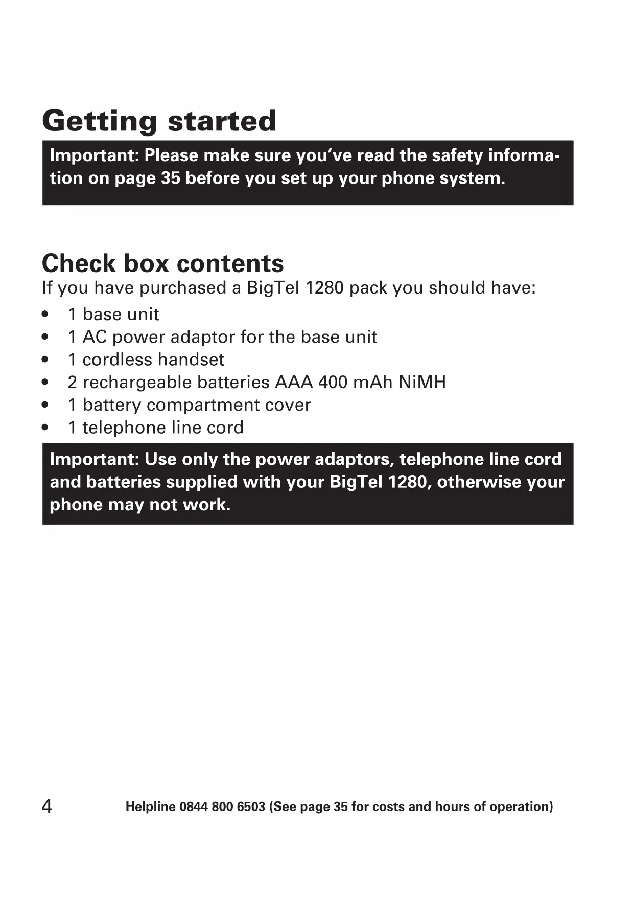 Important: Use only the power adaptors, telephone line cord and batteries supplied with your BigTel 1280, otherwise your phone may not work.