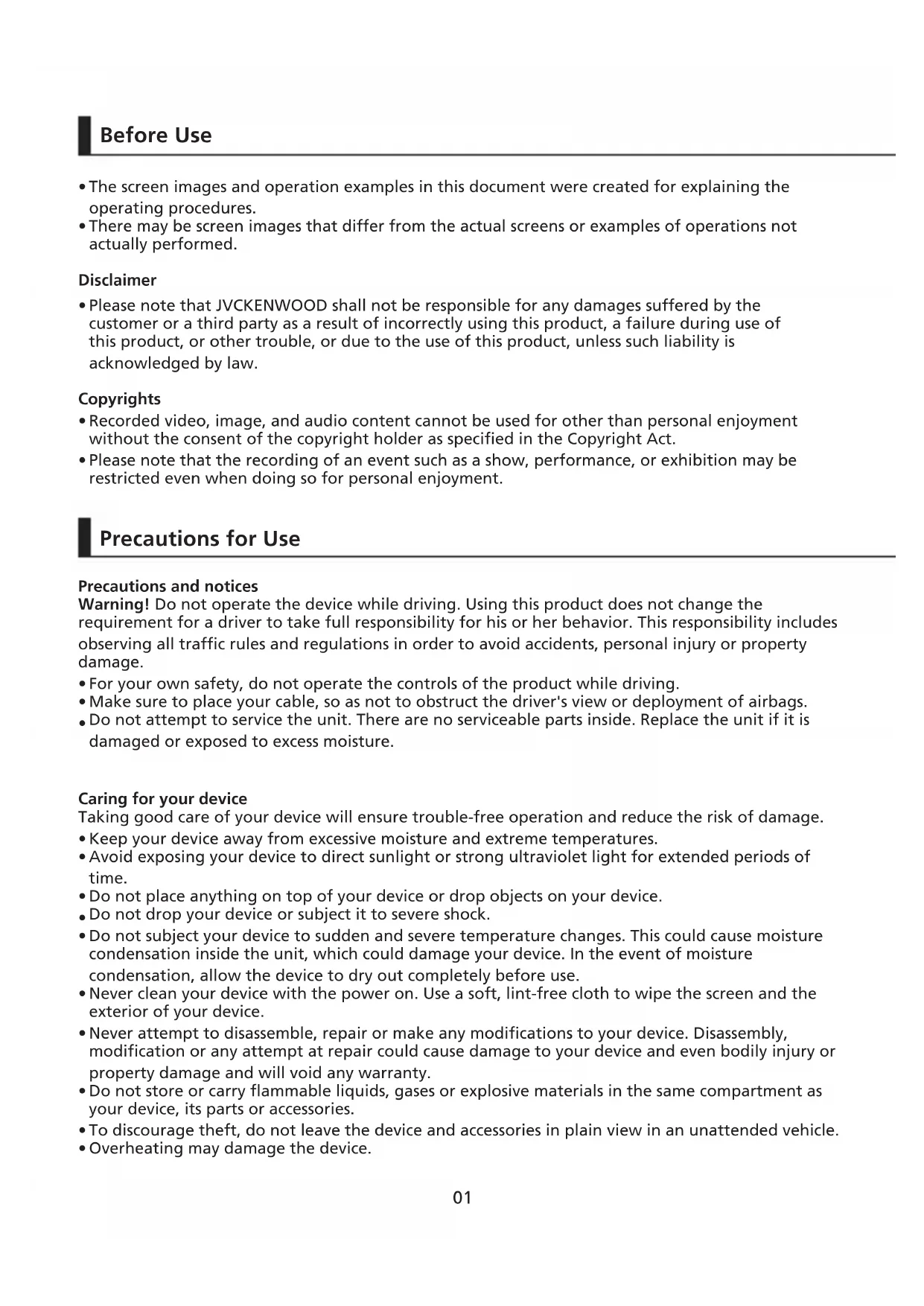 Precautions for installation Precautions for use Cleaning the device If you notice a problem with the device, turn off the power of the device and then contact your dealer or nearest JVCKENWOOD service center.03