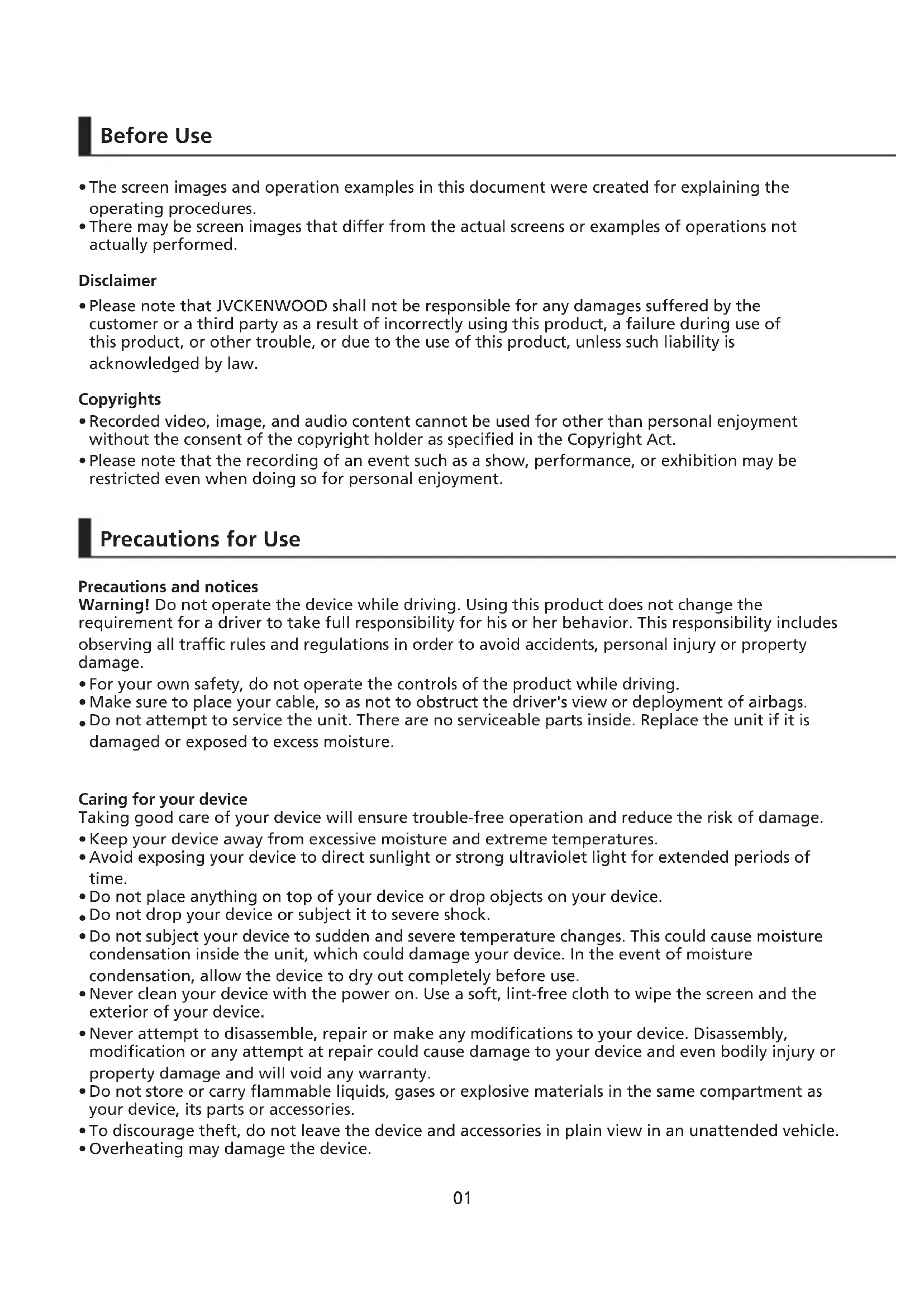 Precautions for installation Precautions for use Cleaning the device If you notice a problem with the device, turn off the power of the device and then contact your dealer or nearest JVCKENWOOD service center.03
