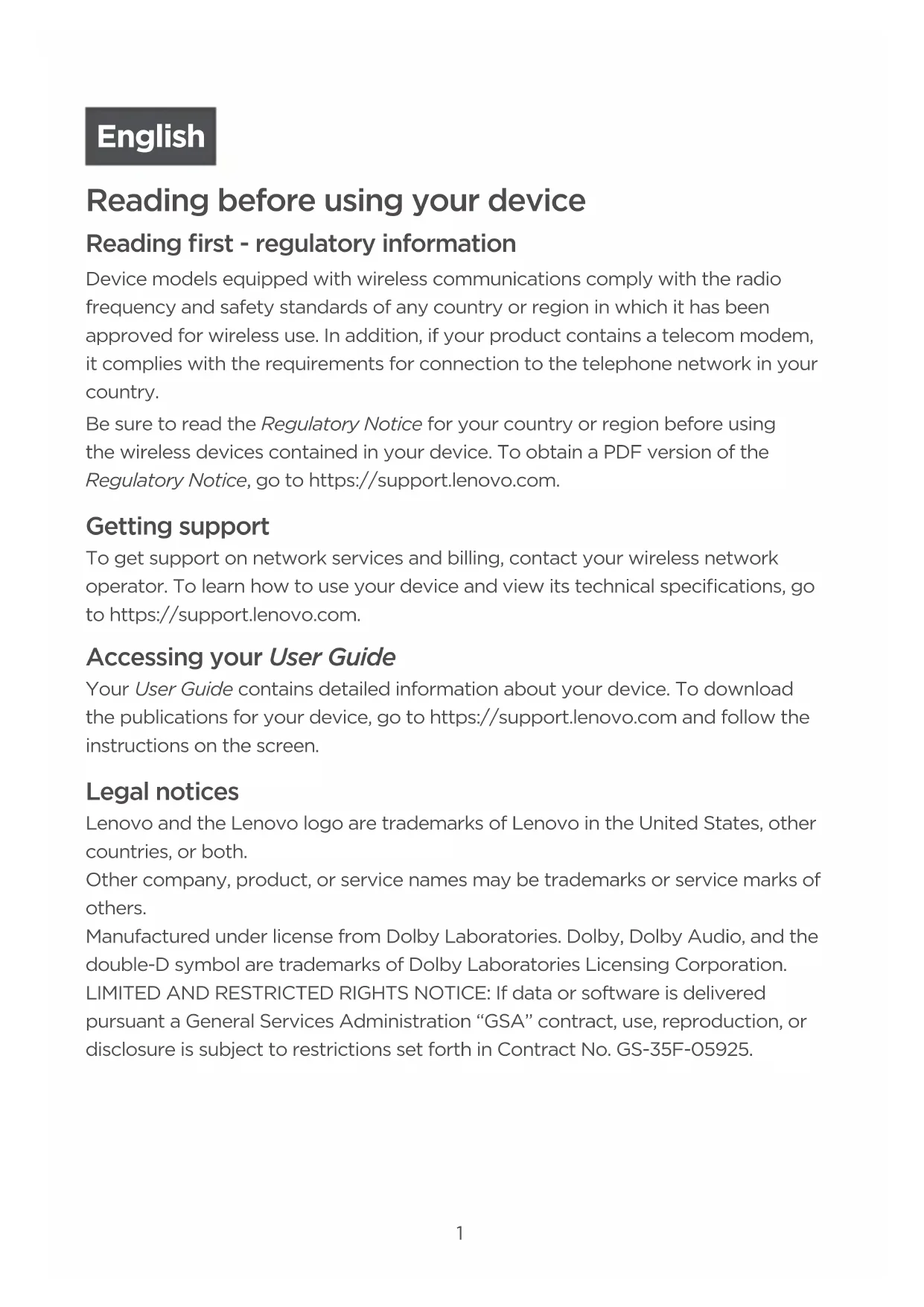 Lenovo Tab M7 (3rd Gen) Safety, Warranty & Quick Start Guide Lenovo TB-7306F Lenovo TB-7306X English/Français/EspañolContents English ...........................................................................................................1 Français .....................................................................................................13 Español ..................................................................................................... 251 English Reading before using your device Reading first - regulatory information Device models equipped with wireless communications comply with the radio frequency and safety standards of any country or region in which it has been approved for wireless use. In addition, if your product contains a telecom modem, it complies with the requirements for connection to the telephone network in your country. Be sure to read the Regulatory Notice for your country or region before using the wireless devices contained in your device. To obtain a PDF version of the Regulatory Notice, go to https://support.lenovo.com. Getting support To get support on network services and billing, contact your wireless network operator. To learn how to use your device and view its technical specifications, go to https://support.lenovo.com. Accessing your User Guide Your User Guide contains detailed information about your device. To download the publications for your device, go to https://support.lenovo.com and follow the instructions on the screen. Legal notices Lenovo and the Lenovo logo are trademarks of Lenovo in the United States, other countries, or both. Other company, product, or service names may be trademarks or service marks of others. Manufactured under license from Dolby Laboratories. Dolby, Dolby Audio, and the double-D symbol are trademarks of Dolby Laboratories Licensing Corporation. LIMITED AND RESTRICTED RIGHTS NOTICE: If data or software is delivered pursuant a General Services Administration “GSA” contract, use, reproduction, or disclosure is subject to restrictions set forth in Contract No. GS-35F-05925.2 Device overview Model Version Lenovo TB-7306F WLAN Lenovo TB-7306X WLAN + LTE