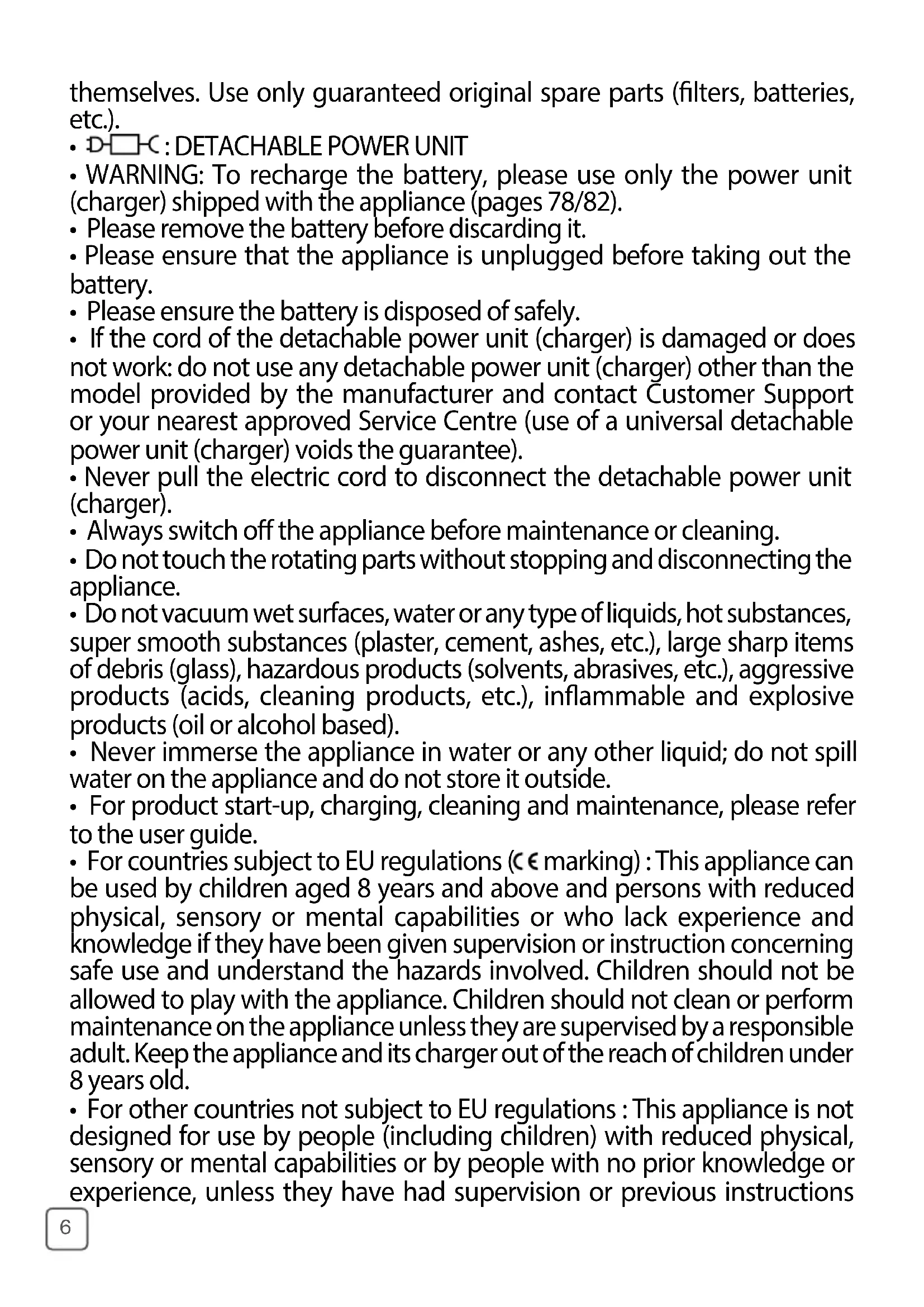 - For countries subject to EU regulations ( marking) : This appliance can be used by children aged 8 years and above and persons with reduced physical, sensory or mental capabilities or who lack experience and knowledge if they have been given supervision or instruction concerning safe use and understand the hazards involved. Children should not be allowed to play with the appliance. Children should not clean or perform maintenance on the appliance unless they are supervised by a responsible adult. Keep the appliance and its charger out of the reach of children under 8 years old.
