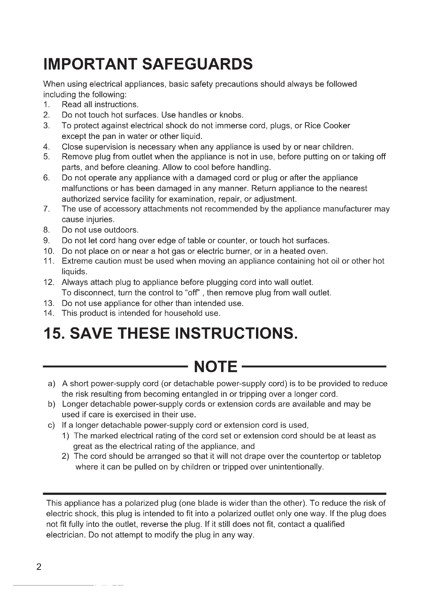 This appliance has a polarized plug (one blade is wider than the other). To reduce the risk of electric shock, this plug is intended to fit into a polarized outlet only one way. If the plug does not fit fully into the outlet, reverse the plug. If it still does not fit, contact a qualified electrician. Do not attempt to modify the plug in any way. a) A short power-supply cord (or detachable power-supply cord) is to be provided to reduce the risk resulting from becoming entangled in or tripping over a longer cord. b) Longer detachable power-supply cords or extension cords are available and may be used if care is exercised in their use. c) If a longer detachable power-supply cord or extension cord is used,