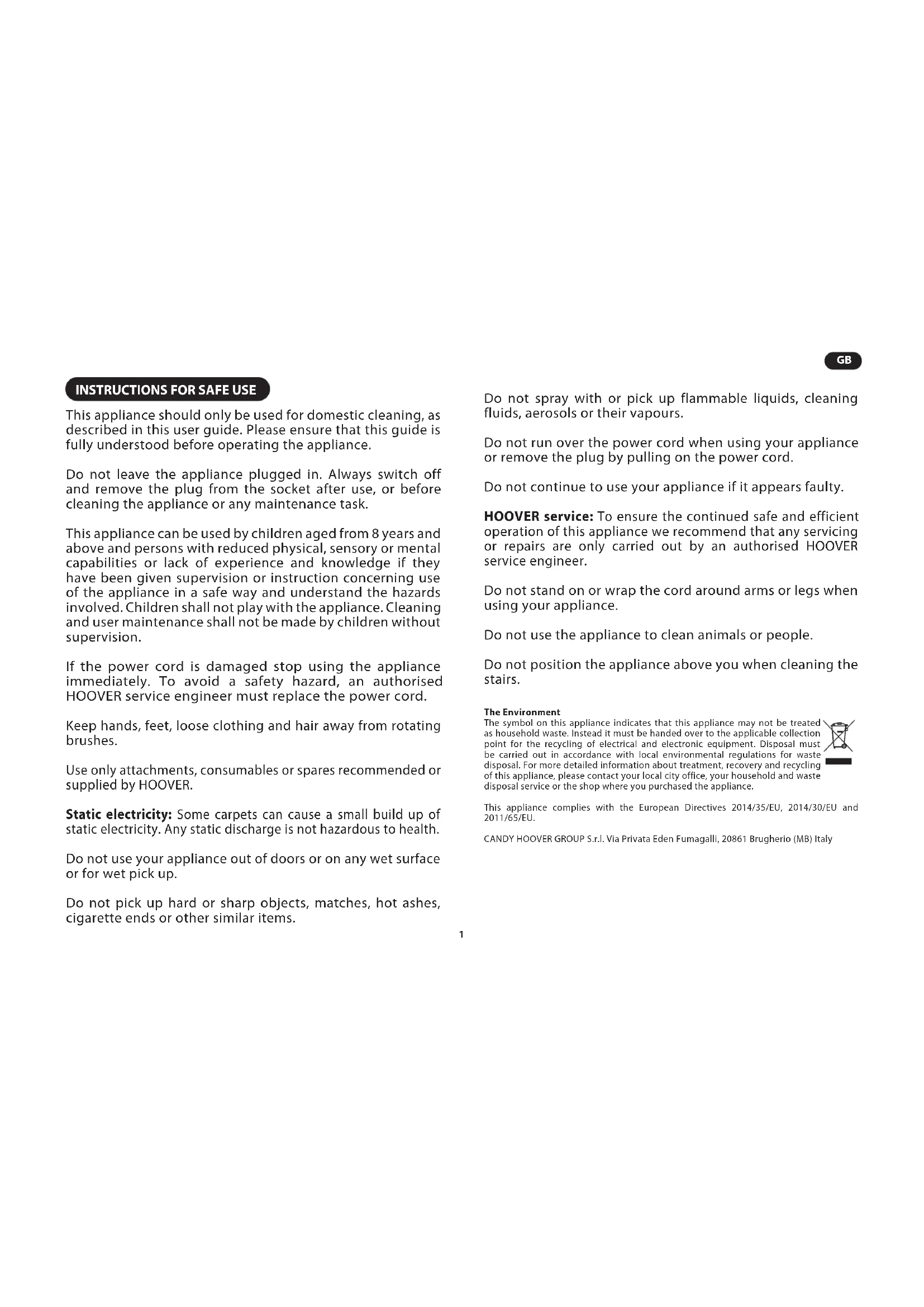 cINSTRUCTIONS FOR SAFE USE This appliance should only be used for domestic cleaning, as described in this user guide. Please ensure that this guide is fully understood before operating the appliance. Do not leave the appliance plugged in. Always switch off and remove the plug from the socket after use, or before cleaning the appliance or any maintenance task. This appliance can be used by children aged from 8 years and above and persons with reduced physical, sensory or mental capabilities or lack of experience and knowledge if they have been given supervision or instruction concerning use of the appliance in a safe way and understand the hazards involved. Children shall not play with the appliance. Cleaning and user maintenance shall not be made by children without supervision. If the power cord is damaged stop using the appliance immediately. To avoid a safety hazard, an authorised HOOVER service engineer must replace the power cord. Keep hands, feet, loose clothing and hair away from rotating brushes. Use only attachments, consumables or spares recommended or supplied by HOOVER. Static electricity: Some carpets can cause a small build up of static electricity. Any static discharge is not hazardous to health. Do not use your appliance out of doors or on any wet surface or for wet pick up. Do not pick up hard or sharp objects, matches, hot ashes, cigarette ends or other similar items. Do not spray with or pick up flammable liquids, cleaning fluids, aerosols or their vapours. Do not run over the power cord when using your appliance or remove the plug by pulling on the power cord. Do not continue to use your appliance if it appears faulty. HOOVER service: To ensure the continued safe and efficient operation of this appliance we recommend that any servicing or repairs are only carried out by an authorised HOOVER service engineer. Do not stand on or wrap the cord around arms or legs when using your appliance. Do not use the appliance to clean animals or people. Do not position the appliance above you when cleaning the stairs. The Environment The symbol on this appliance indicates that this appliance may not be treated as household waste. Instead it must be handed over to the applicable collection point for the recycling of electrical and electronic equipment. Disposal must be carried out in accordance with local environmental regulations for waste disposal. For more detailed information about treatment, recovery and recycling of this appliance, please contact your local city office, your household and waste disposal service or the shop where you purchased the appliance. This appliance complies with the European Directives 2014/35/EU, 2014/30/EU and 2011/65/EU. CANDY HOOVER GROUP S.r.l. Via Privata Eden Fumagalli, 20861 Brugherio (MB) Italy