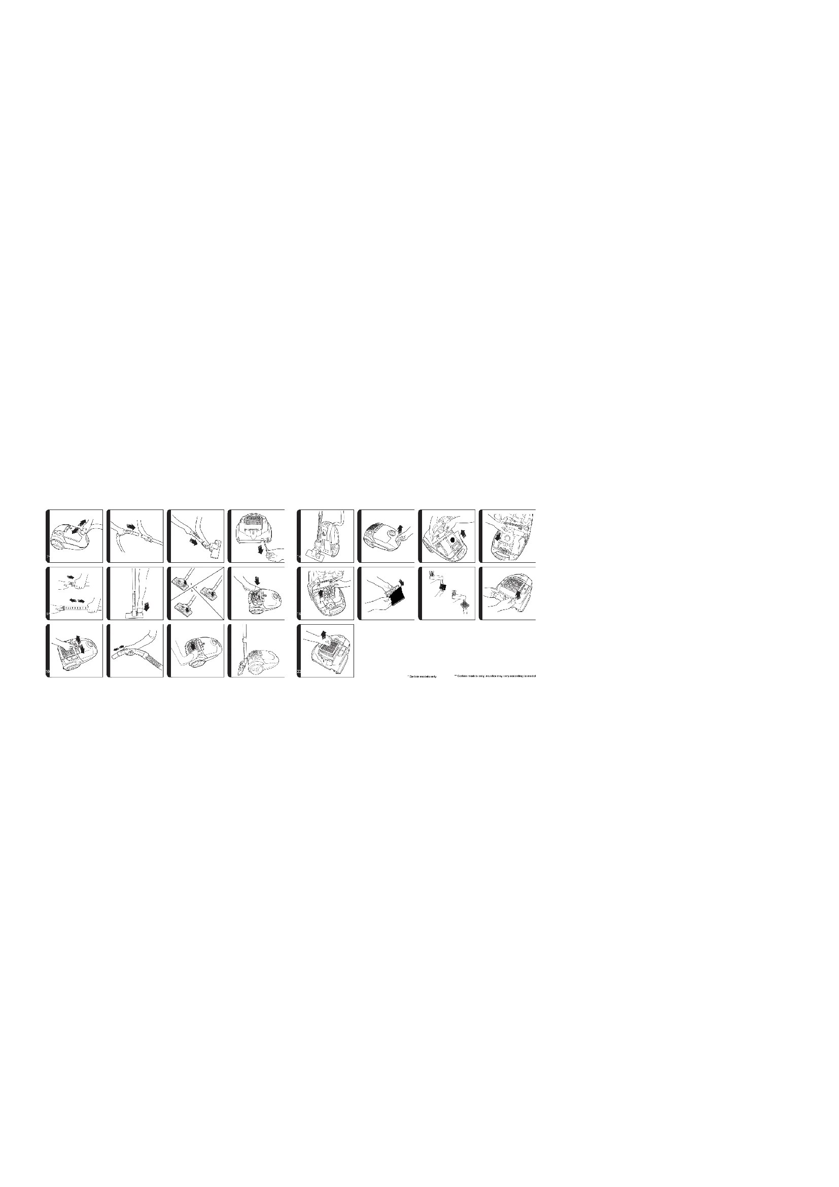 To obtain the best performance and efficiency it is recommended that the correct nozzles are used for the main cleaning operations. These nozzles are indicated in the diagrams by the letters GP, HF or CA. A nozzle type GP can be used to clean both carpet and hard floor. A nozzle type HF is suitable for use only on hard floor. A nozzle of type CA is suitable for use only on carpet. The other nozzles are accessories for specialist cleaning tasks and are recommended for occasional use only. The Crevice tool, Furniture nozzle and Dusting brush are stored on board under the accessories door. All accessories can be fitted to the end of the handle or the end of the Telescopic* Tube. Crevice Tool – For corners and hard to reach areas. [S1] Furniture Nozzle – For soft furniture and fabrics. [S2] Dusting Brush – For bookshelves, frames, keyboards, etc. [S3] Pet Hair Remover Turbo Nozzle* - Use the mini turbo nozzle on stairs or for deep cleaning on textile surfaces and other hard to clean areas. Particularly suitable for pet hair removal. [T] Allergen Remover Mini Turbo Nozzle* – Use the mini turbo nozzle on stairs or for deep cleaning on textile surfaces and other hard to clean areas. Particularly suitable for allergen removal. [U] Grand Turbo Nozzle* - Use the Grand Turbo Nozzle for deep cleaning on carpets. [V] Hard Floor Caresse Nozzle* - For parquet floors and other delicate floors. [W] IMPORTANT: Do not use the Grand Turbo Nozzle on rugs with long fringes, animal hides and carpet pile deeper than 15mm. Do not keep the nozzle stationary while the brush is rotating. USER CHECKLIST Should you have a problem with the product, complete this simple user checklist before calling your local Hoover service.