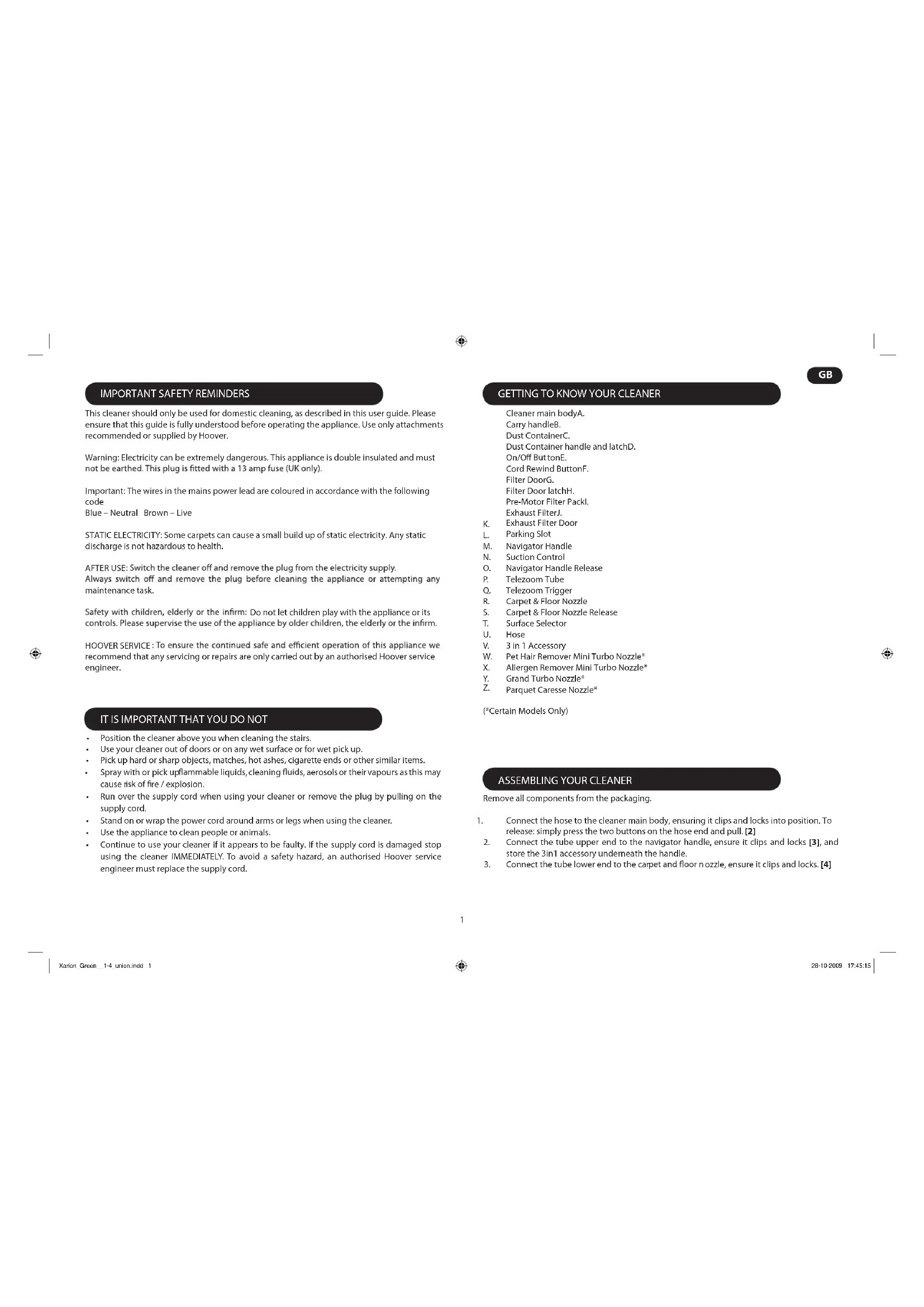 (*Certain Models Only) Remove all components from the packaging. Connect the hose to the cleaner main body, ensuring it clips and locks into position. To 1. release: simply press the two buttons on the hose end and pull. [2] Connect the tube upper end to the navigator handle, ensure it clips and locks 2. [3], and store the 3in1 acc essory underneath the handle. Connect the tube lower end to the car ozzle, ensure it clips and locks. 3. [4] Position the cleaner above you when cleaning the stairs.• Use your cleaner out of doors or on any wet surface or for wet pick up.• Pick up hard or sharp objects, matches, hot ashes, cigarette ends or other similar items.• Spray with or pick up liquids, cleaning s, aerosols or their vapours as this may • cause r re / explosion. Run over the supply cord when using your cleaner or remove the plug by pulling on the • supply cord. Stand on or wrap the power cord around arms or legs when using the cleaner.• Use the appliance to clean people or animals.• Continue to use your cleaner if it appears to be faulty. If the supply cord is damaged stop • using the cleaner IMMEDIATELY. To avoid a safety hazard, an authorised Hoover service engineer must replace the supply cord. Xarion_Green__1-4_union.indd 1 28-10-2009 17:45:15 Exhaust Filter Door