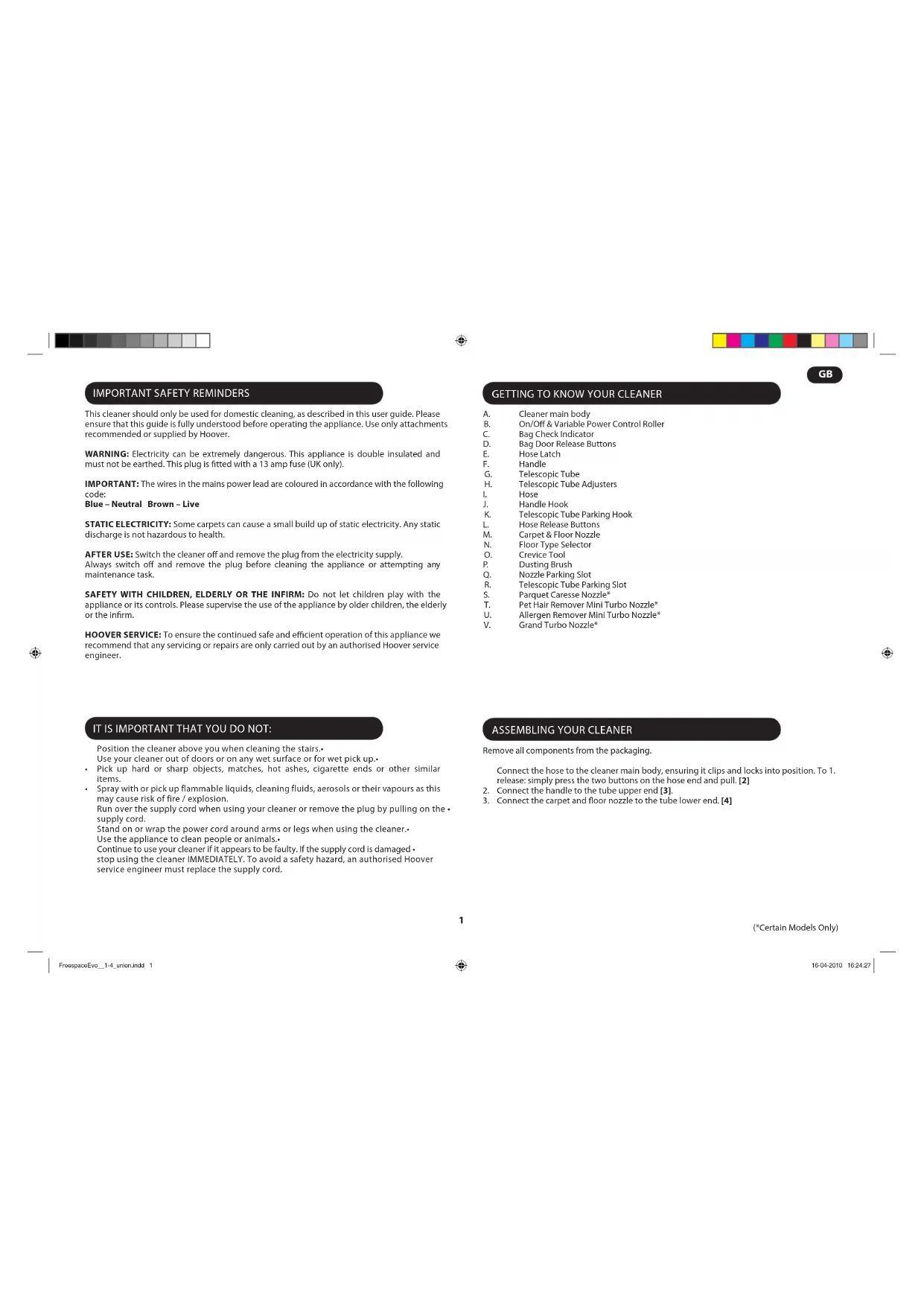 (*Certain Models Only) ACCESSORIES Please see the model specication on the packaging label for inclusion of accessories to individual models. All accessories can be tted to the hose handle or the end of the telescopic tube. Crevice Tool – For corners and hard to reach areas. Remove the Crevice tool from the accessories holder [24] and t to the hose handle [25] or telescopic tube. Dusting Brush – For bookshelves, frames, keyboards and other delicate areas. Remove the dusting brush from the accessories holder [24] and t to the crevice tool then t to the hose handle [25] or telescopic tube. Parquet Caresse Nozzle* – For parquet oors and other delicate oors.[1S] Pet Hair Remover Mini Turbo Nozzle* - Use the mini turbo nozzle on stairs or for deep cleaning on textile surfaces and other hard to clean areas. Particularly suitable for pet hairs removal. [1T] Allergen Remover Mini Turbo Nozzle* – Use the mini turbo nozzle on stairs or for deep cleaning on textile surfaces and other hard to clean areas. Particularly suitable for allergen removal. [1U] Grand Turbo Nozzle* – Use the Grand Turbo Nozzle for deep cleaning on carpets. [1V] IMPORTANT: Do not use the Grand Turbo Nozzle or Mini Turbo Nozzles on rugs with long fringes, animal hides and carpet pile deeper than 15mm. Do not keep the nozzle stationary while the brush is rotating. USER CHECKLIST Should you have a problem with the product, complete this simple user checklist before calling your local Hoover service. Is there a working electricity supply to the cleaner? Please check with another electrical • appliance. Is the Bag over-filled? Please refer to ‘Cleaner Maintenance’.• Is the filter blocked? Please refer to ‘Cleaner Maintenance’.• Is the hose or nozzle blocked? Please refer to ‘Removing a blockage from the system’.• Has the cleaner overheated? If so, it will take approximately 45 minutes to automatically • reset. IMPORTANT INFORMATION Hoover Spares and Consumables Always replace parts with genuine Hoover spares. These are available from your local Hoover dealer or direct from Hoover. When ordering parts always quote your model number. Consumables Paper Bag: H69 - 35601053• Micro Fibre Bag: H71 - 35601069 (If Available)• Exhaust Micro Filter: T102 - 35601056• Hepa Pre-Motor Filter: S107 - 35601057• Spares Carpet & Floor Nozzle - G72 - 4845090• Fabric Hose: - D118 - 35601054• Flexible Hose - D122 - 35601055• Parquet Caresse Nozzle: G90PCB - 35600934• Allergen Remover Mini Turbo Nozzle: J32 - 35600817• Grand Turbo Nozzle: J31 - 35600816• Hoover Service Should you require service at any time, please contact your local Hoover Service Oce. FreespaceEvo__1-4_union.indd 3 16-04-2010 16:24:284