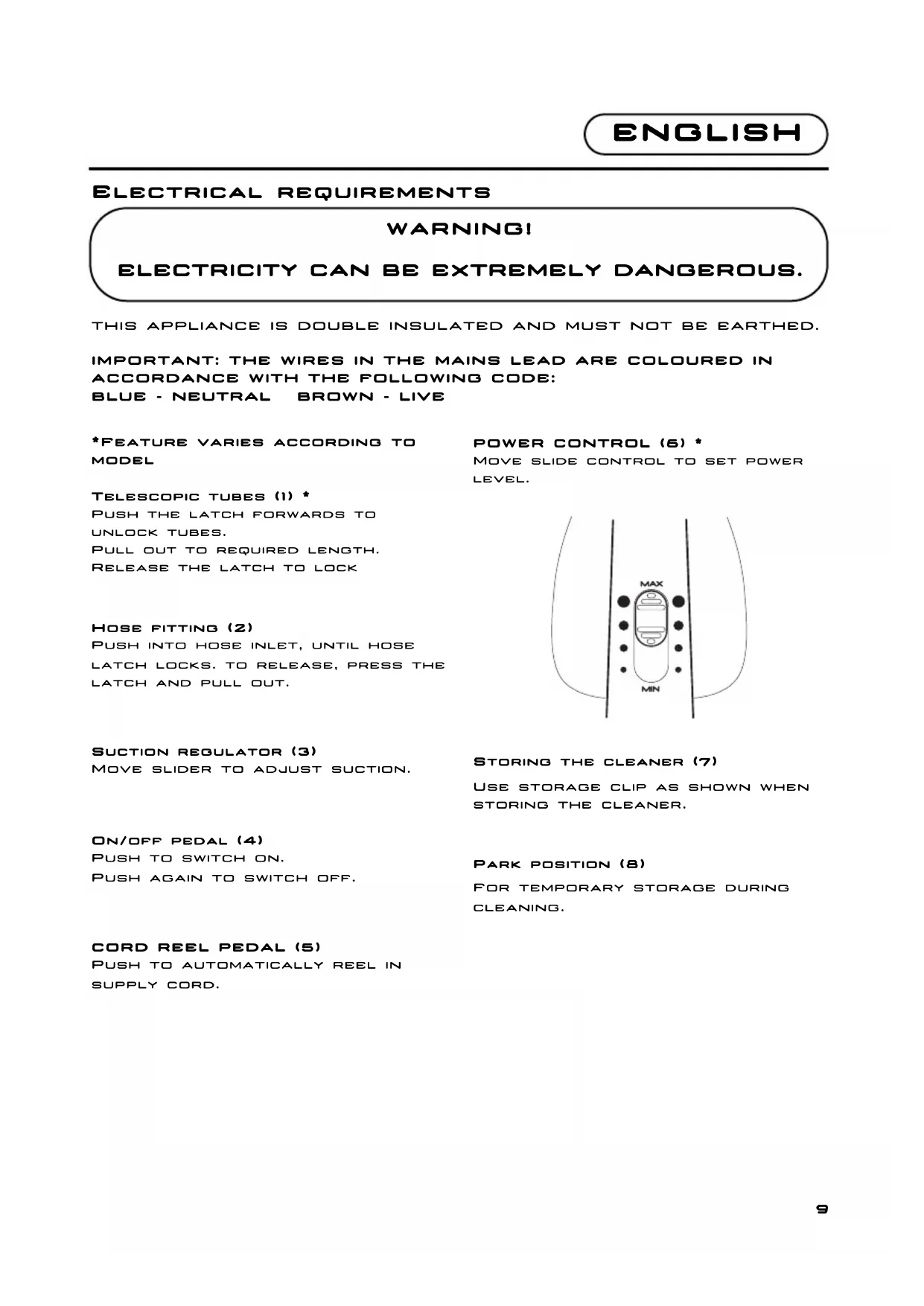 WARNING! ELECTRICITY CAN BE EXTREMELY DANGEROUS. *Feature varies according to model Telescopic tubes (1) *Push the latch forwards tounlock tubes.Pull out to required length.Release the latch to lockHose fitting (2)Push into hose inlet, until hoselatch locks. to release, press thelatch and pull out.Suction regulator (3) Move slider to adjust suction. On/off pedal (4) Push to switch on. Push again to switch off. CORD REEL PEDAL (5) Push to automatically reel in supply cord. POWER CONTROL (6) *Move slide control to set powerlevel.Storing the cleaner (7) Use storage clip as shown when storing the cleaner. Park position (8) For temporary storage during cleaning.Carpet/floor nozzle (9) A) Carpet position - brushes in B) Hard floor position - brushes out Cleaning tools (10) A multi cleaning tool is supplied with your product. This tool is stored on board the cleaner as shown. The multi tool brushes can be deployed to create a dusting brush.